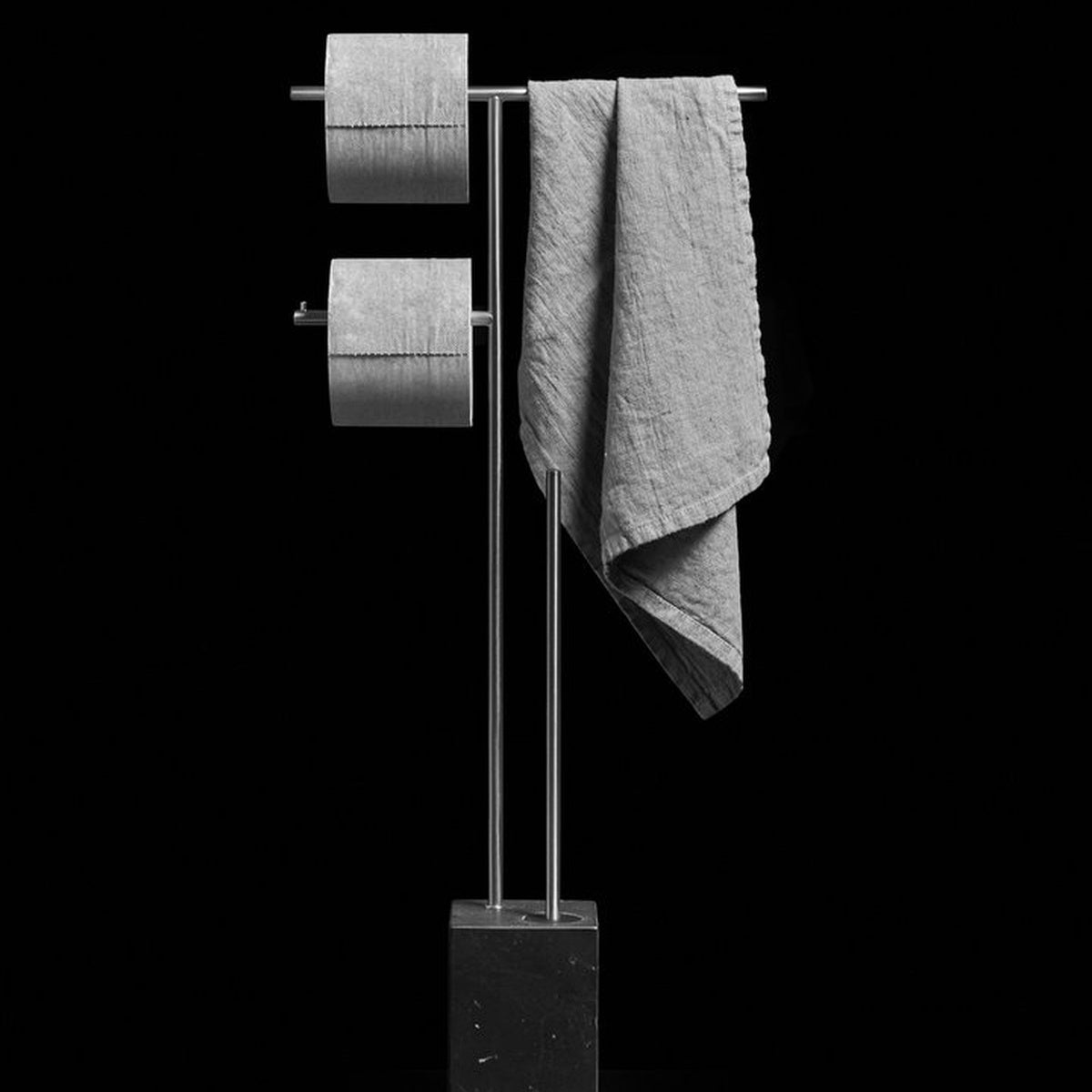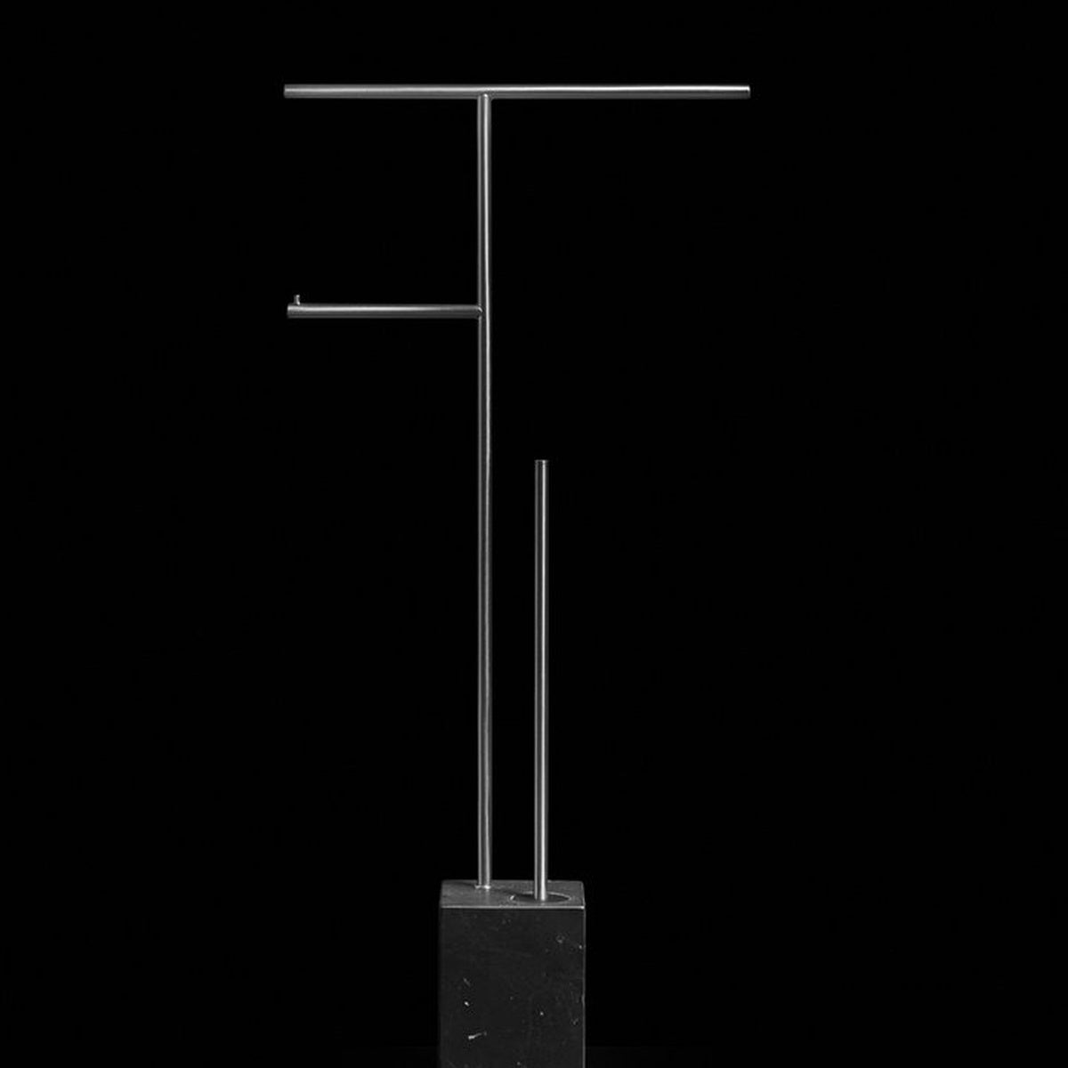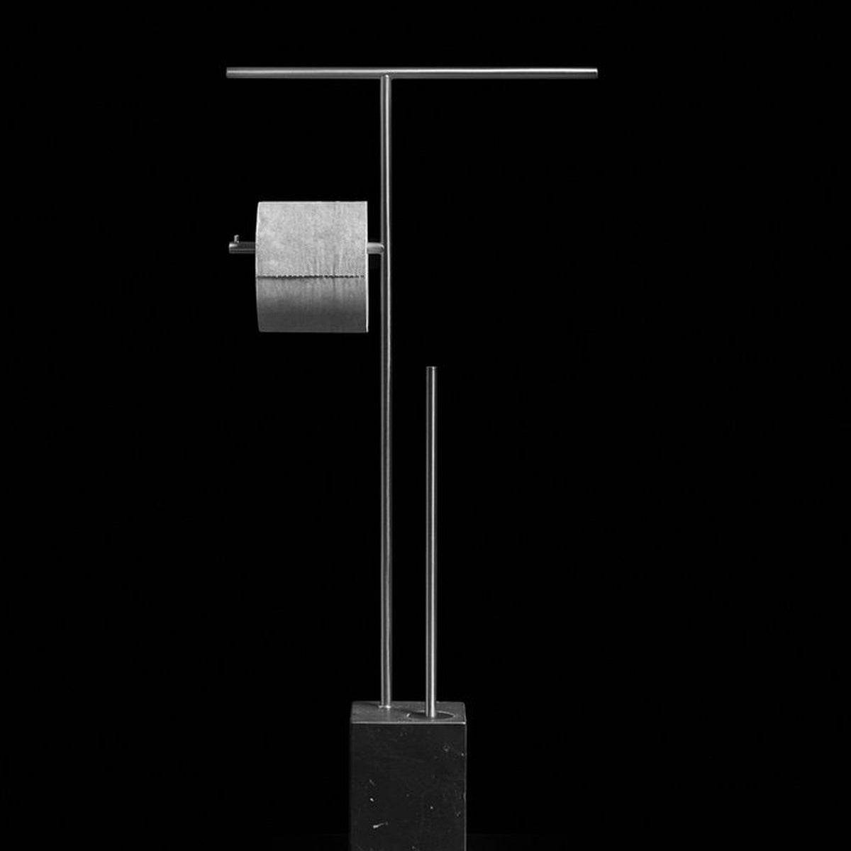 The Bivio collection has a graphic and rigorous sign, completed with the insertion of the black silicone spatula brush holder, ensuring perfect hygiene as well as giving the object an innovative concept. The cubic base in Carrara Marble or Nero Marquinia, refers to the precious heritage of the earth, the metal structure is in brass with a satin steel finish, available in various colors upon request.
