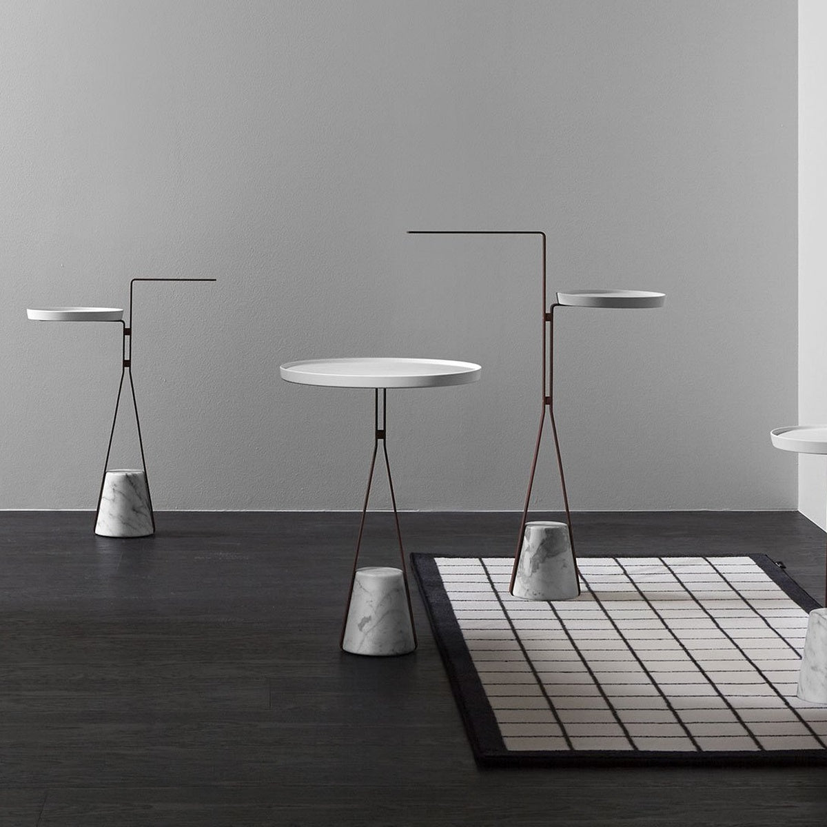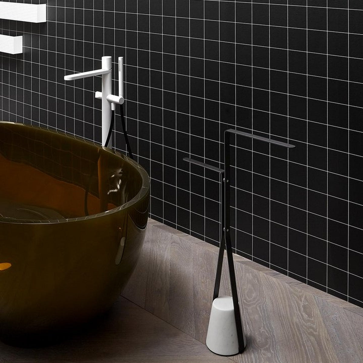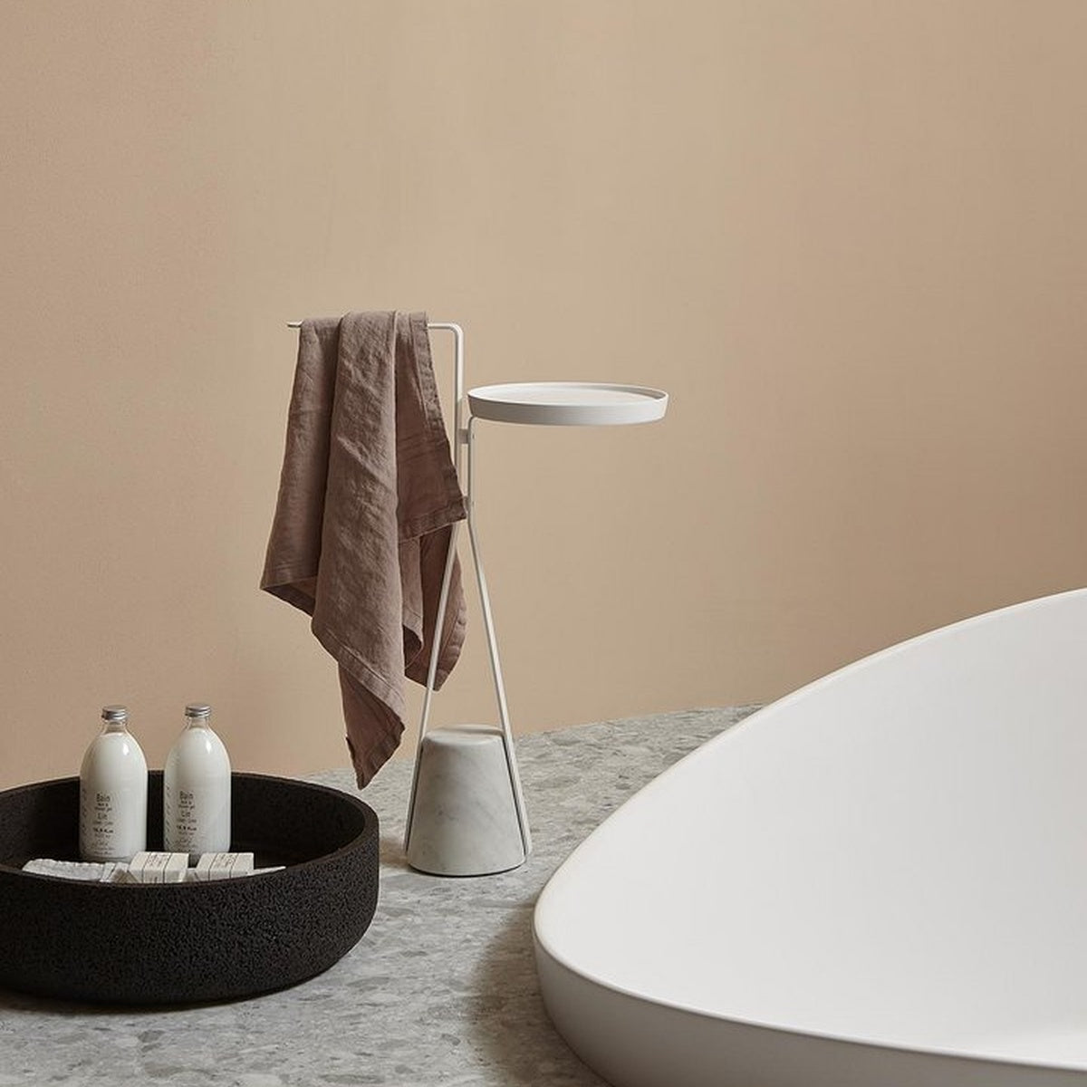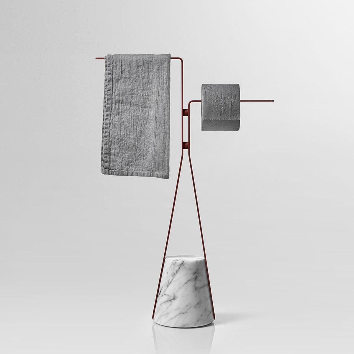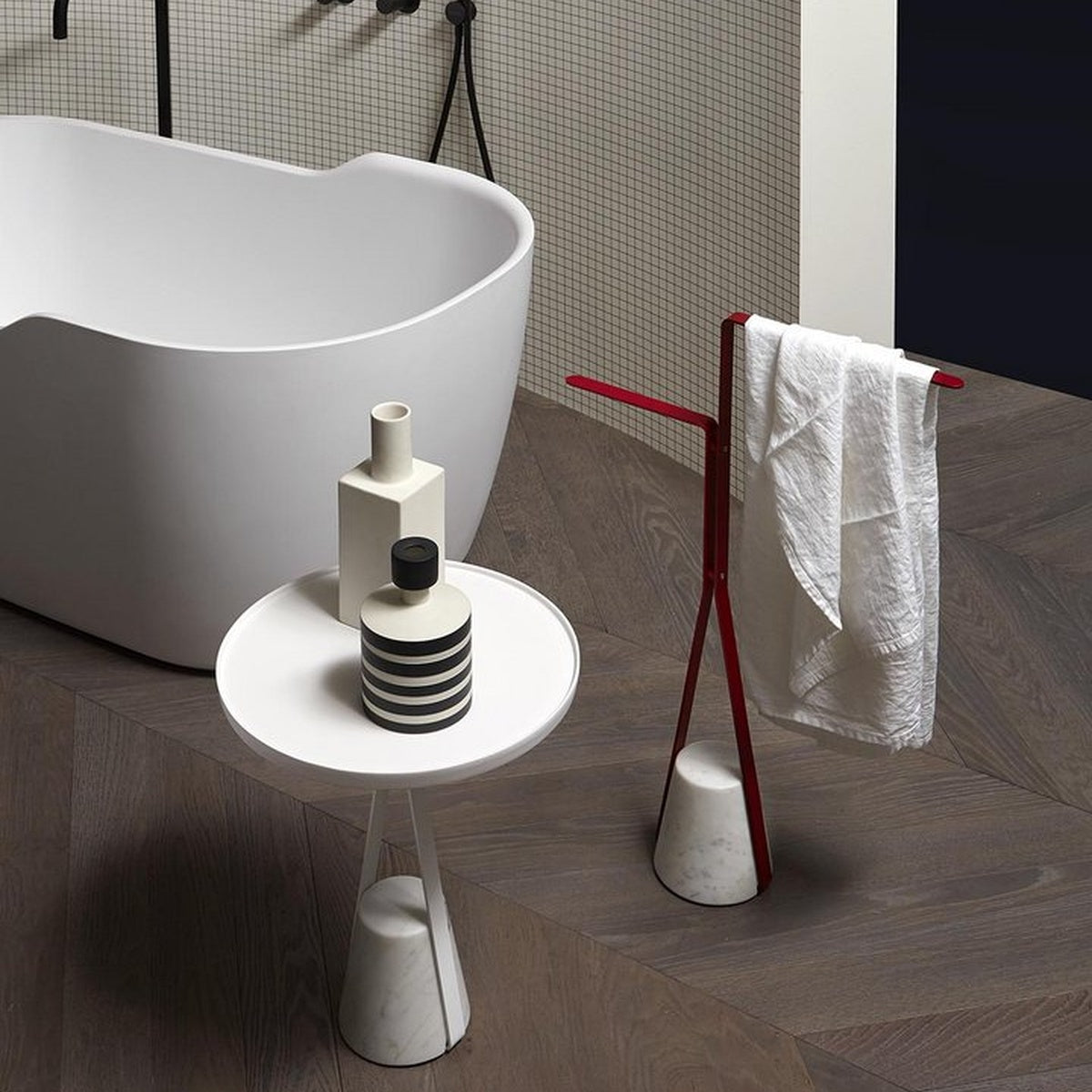 The material character of the base, the elegant path described by the structure, come together for a balance that arises from the contrast between the desire to hover in the air and the force of gravity that opposes it, to anchor it to the ground. Like an elastic that is dragged downwards, but which then finds resistance and consistency to become a support in turn. Halo is a family of freestanding accessories and tables that redefines the image of a functional element for daily use inside the bathroom, but which can also be used in other rooms of the house, for example, the door stop version.