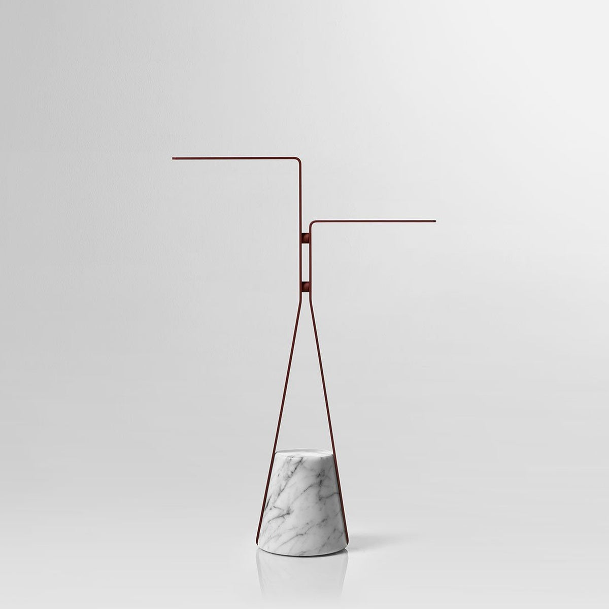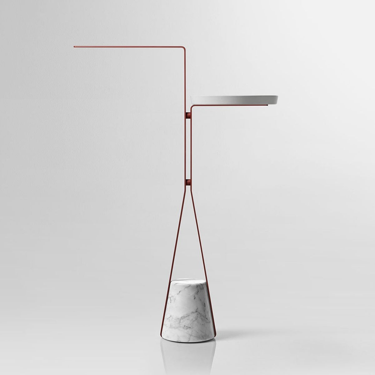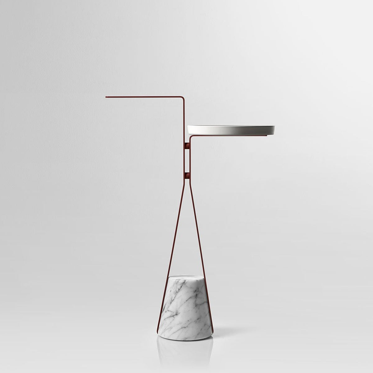 A truncated cone base in satin Carrara marble as an identity trait, a brass metal structure, available in the different colors that antoniolupi offers, and a profile to find a meeting point at a certain height from which to develop the different configurations. In the table version, for example, the circular tray made of Flumood or Colormood, provides a convenient support surface for placing objects intended for personal care and for carrying out personalized wellness rituals.
