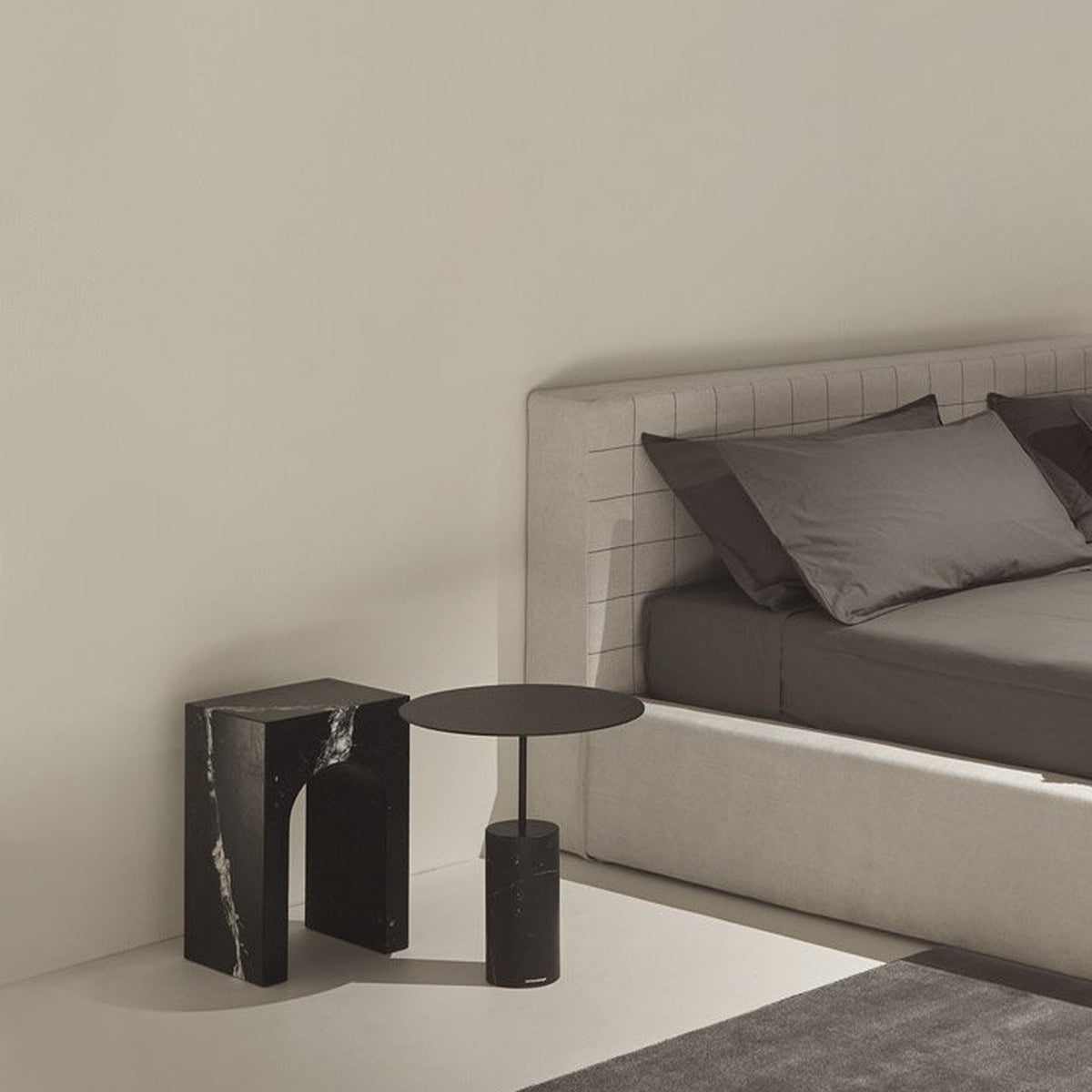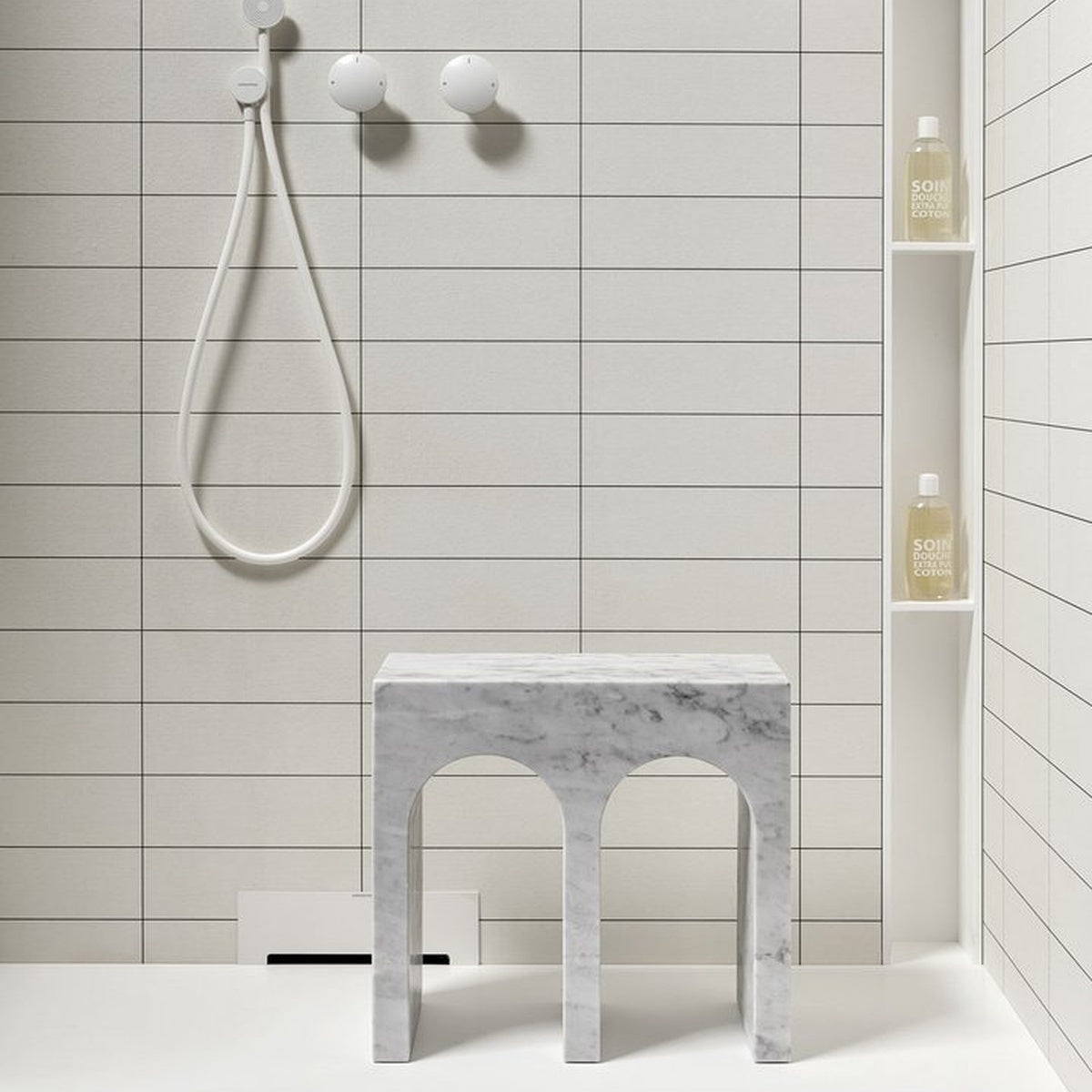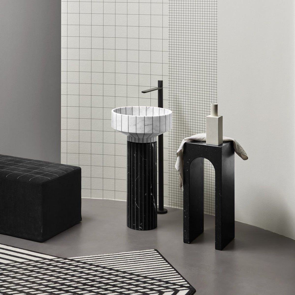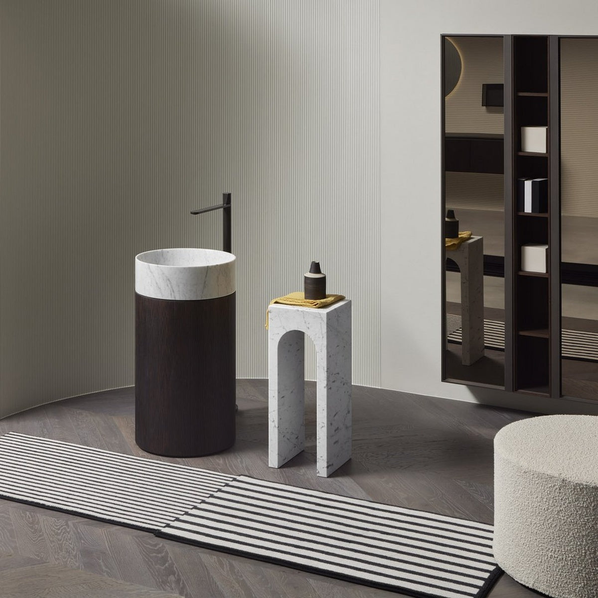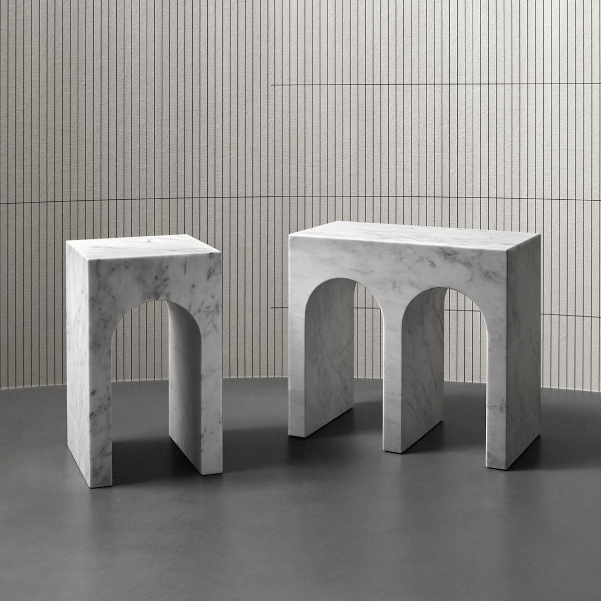 The profile is the unmistakable one of the “Palazzo della Civiltà Italiana”, symbol of the EUR district in Rome, with its absolute geometry and arched openings; the material, Bianco Carrara marble, refers to the classicism of the shapes to the imposing size, thickness, absolute and timeless elegance. The leap in scale allows you to move from a building to an object with style, coherence, and proportional balance. This is how the Roma coffee table collection was born, as a precious ally in the bathroom but also as a bedside table or in a living room with refined furnishings. Available single or in the double version