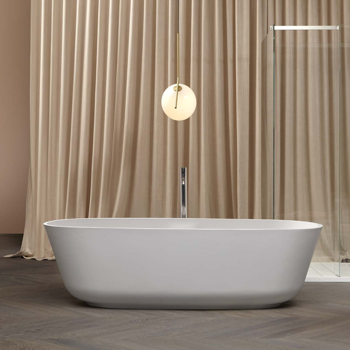 Oval Cristalplant bathtub, can be externally lacquered in all colors of our collection, available also in stone, complete with drain and pressure plug, siphon and flexible hose.