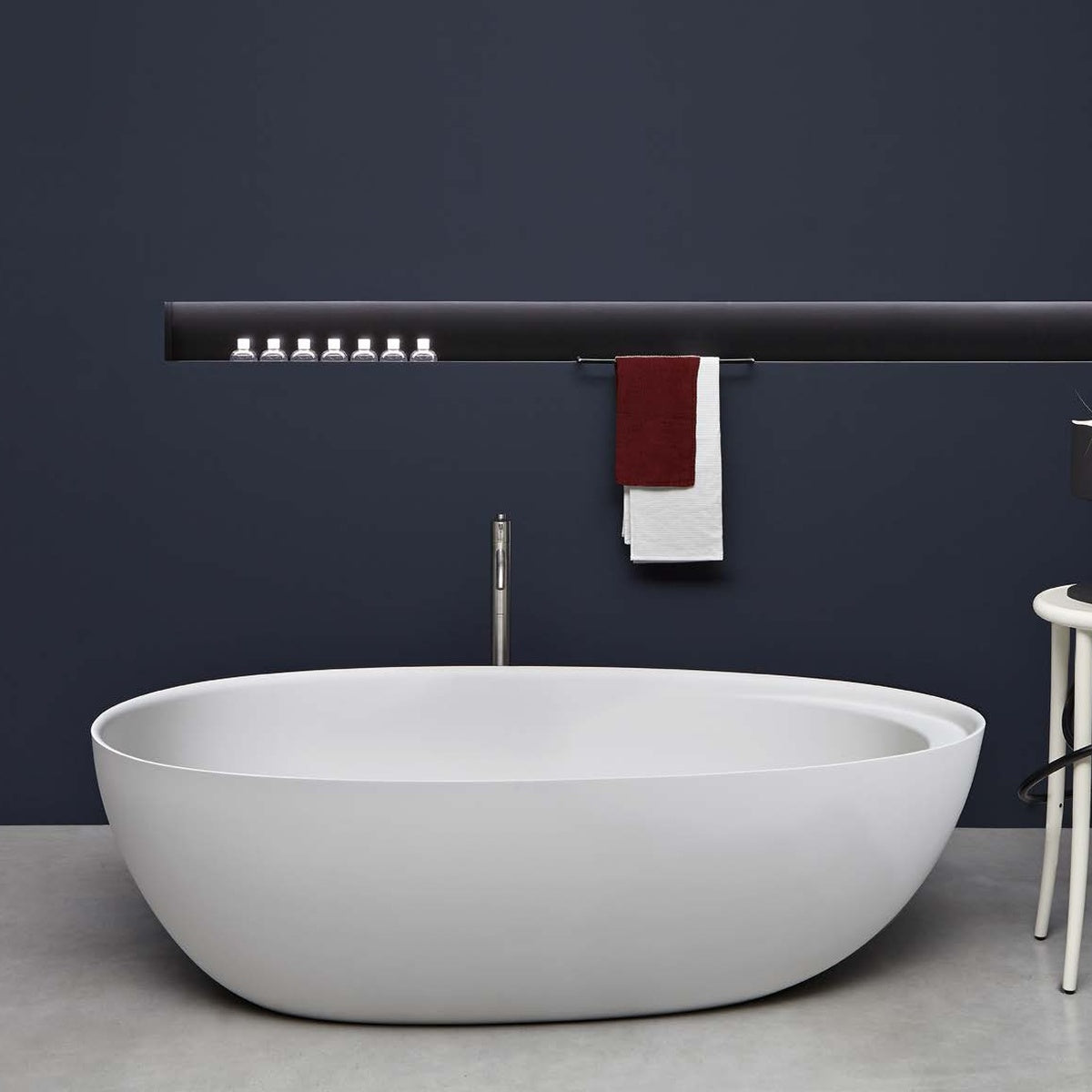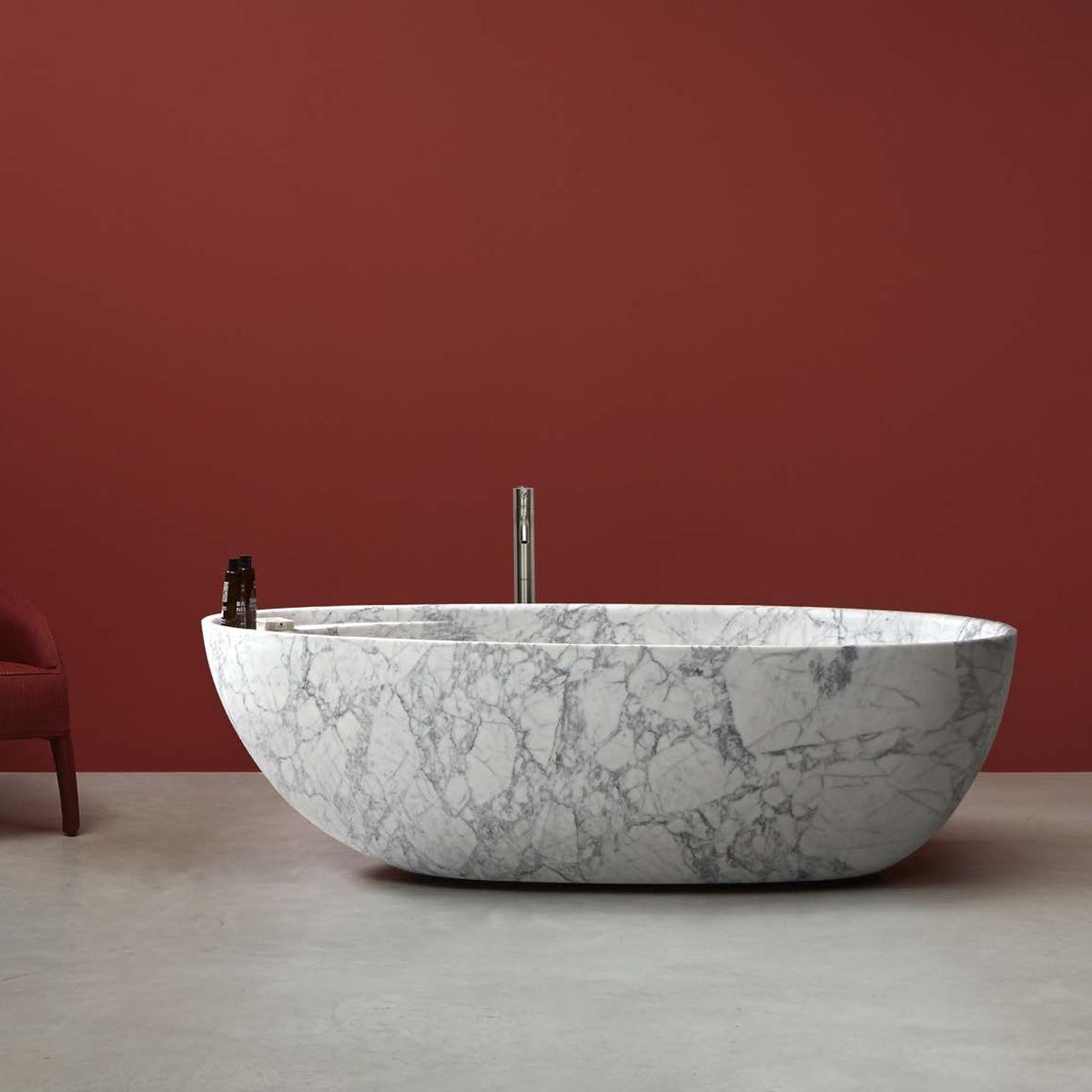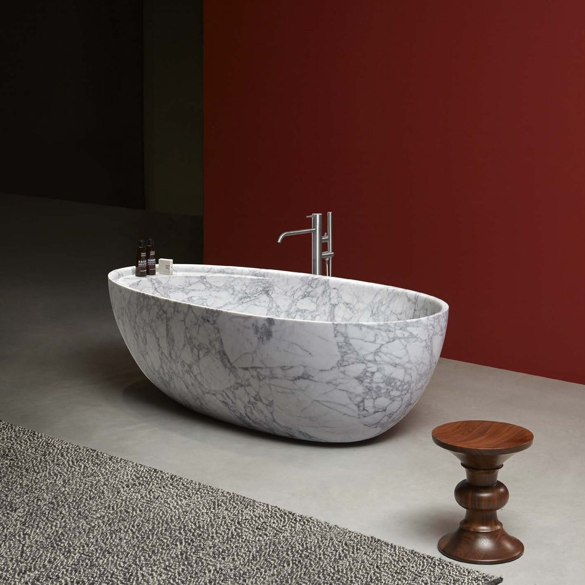 A bathtub able to take center stage but also to be set aside against a wall, an enveloping volume with an egg shape that ergonomically protects the body. Eclipse is a refined interpretation of an organic style, a contemporary expression of relaxation, an image of design embellished today by the new version made of Carrara marble. A monolithic form well-defined in every detail, a complete project that in addition to giving identity to space, investigates the functional aspects related to relaxation thanks to a sophisticated shelf perfectly integrated into the edge.