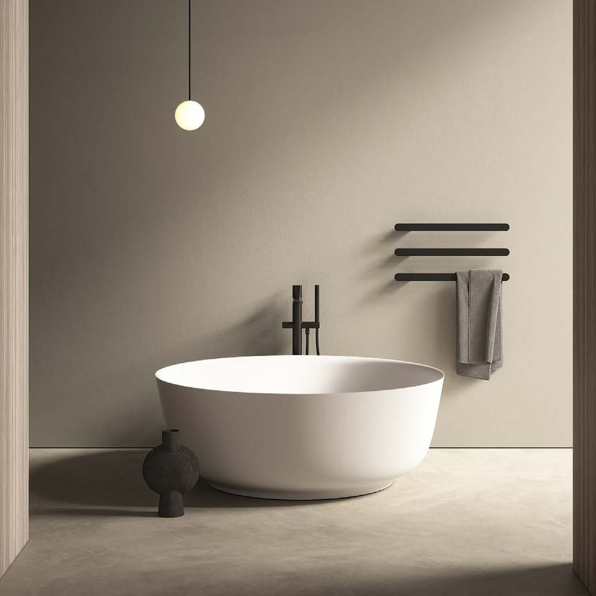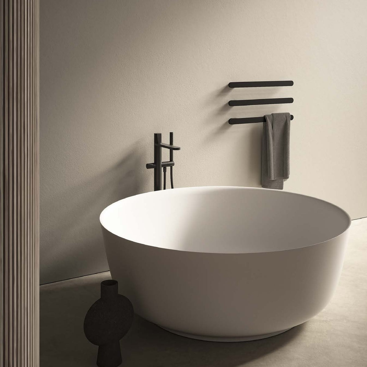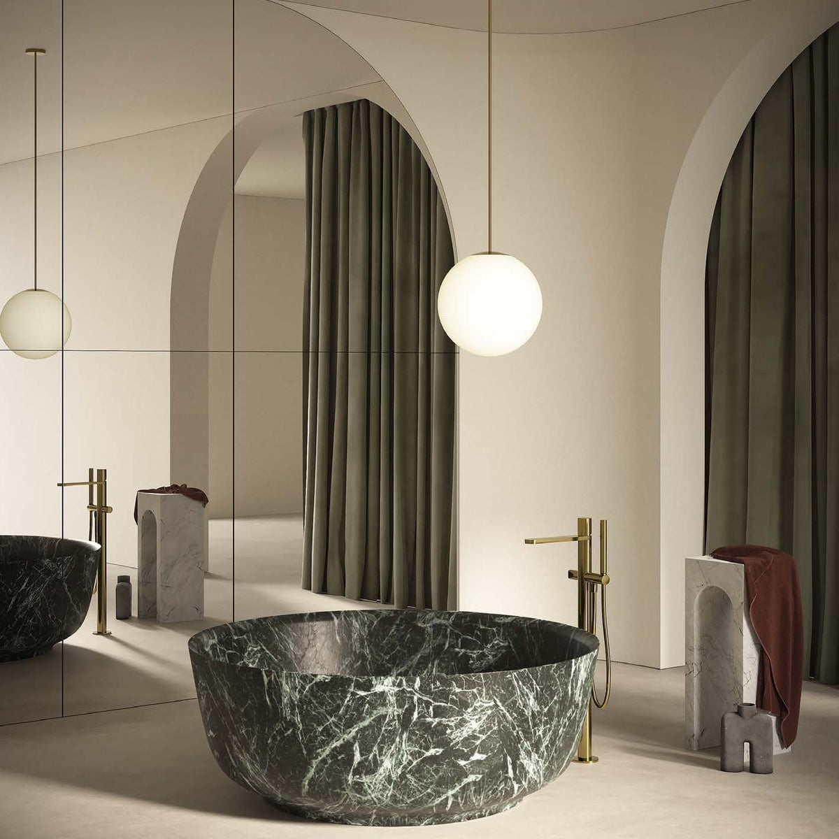 A round bathtub, a welcoming basin in which to totally immerse oneself for a purification ritual, a volume originated from a narrower base that opens toward the edge to accommodate the body comfortably and ergonomically. Orion captures attention and hierarchically defines the place of relaxation with its own presence and the dialogue triggered between the uniqueness of the natural stone and the geometries of the other elements that fit into the environment. From the faucets to the accessories.