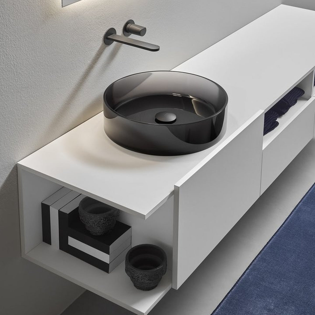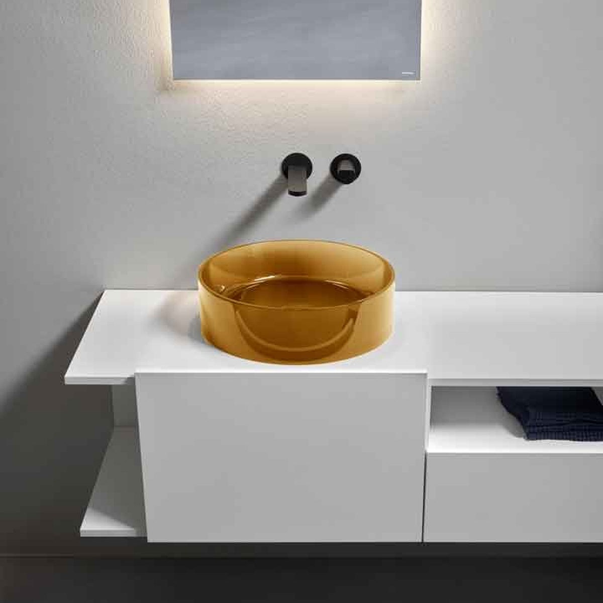Round top mount sink in Cristalmood or Icemood, available in various colors complete with drain pipe fitting and open plug.