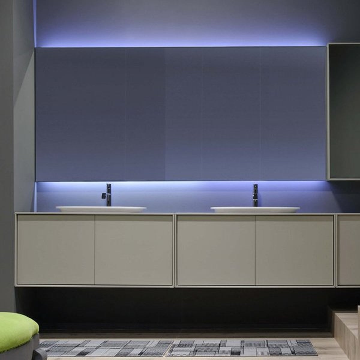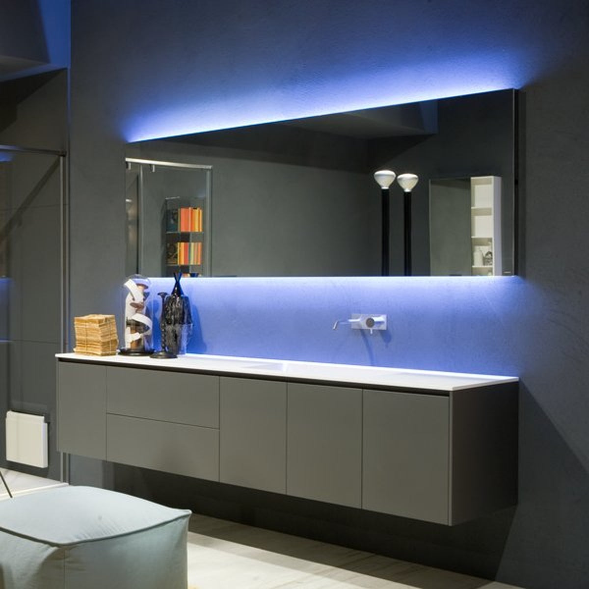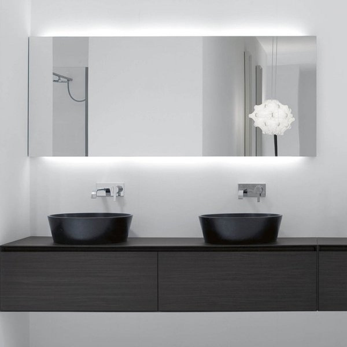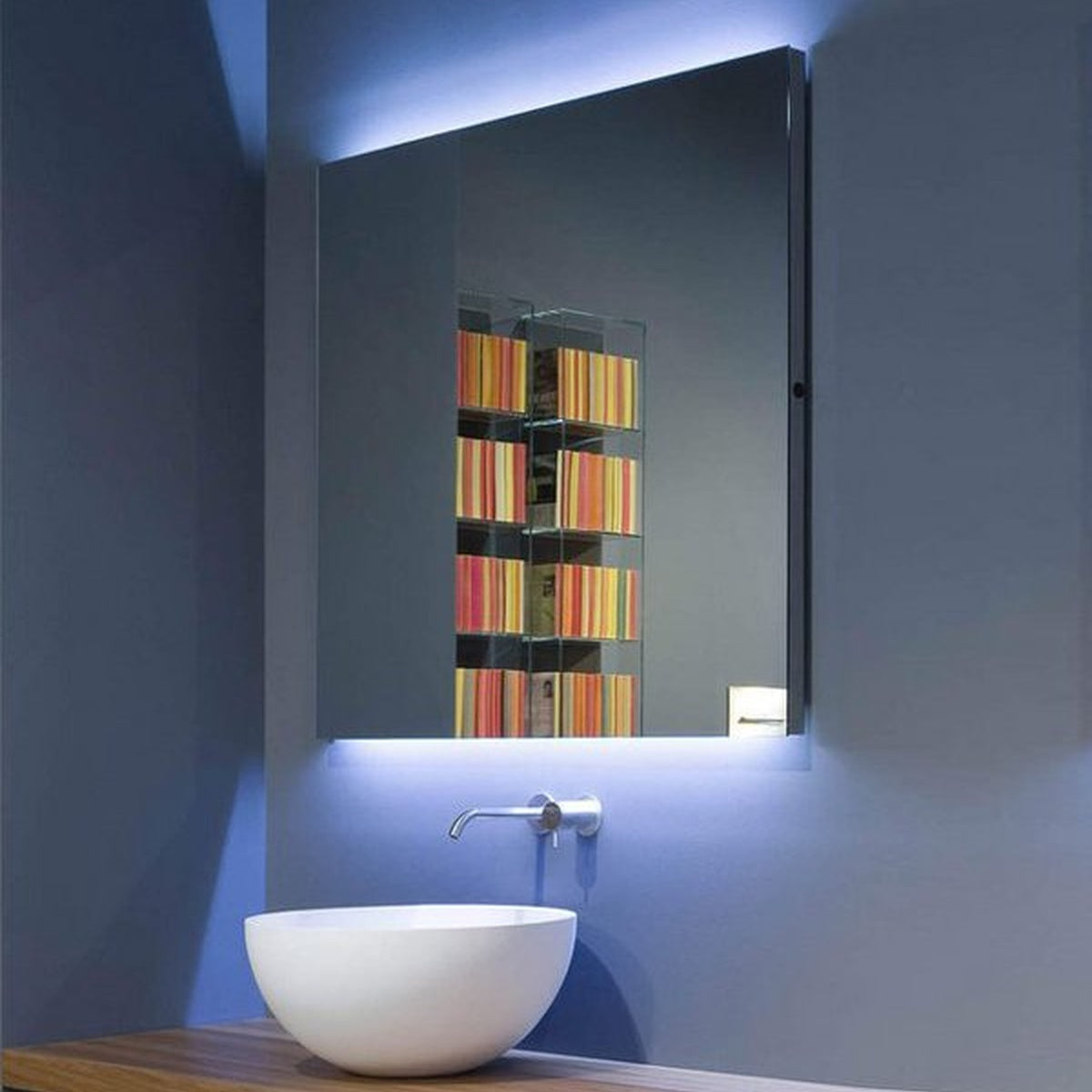 A perfect surface, a clean perimeter, absolute, without a visible frame in fact only visible from the sides. The front view is stunning and essential with a delicate impact of white or blue led lighting that underlines in a soft and diffused manner the superior and inferior part of the mirror.
