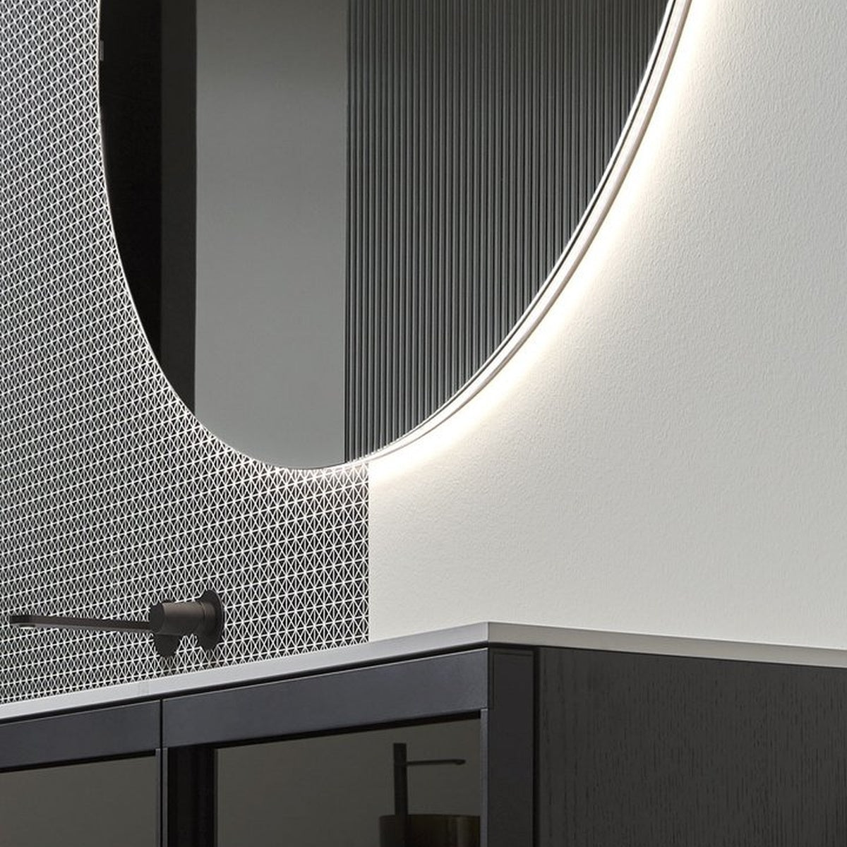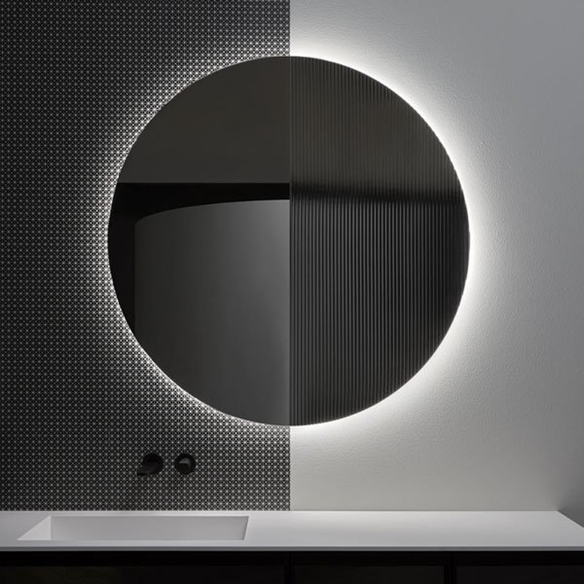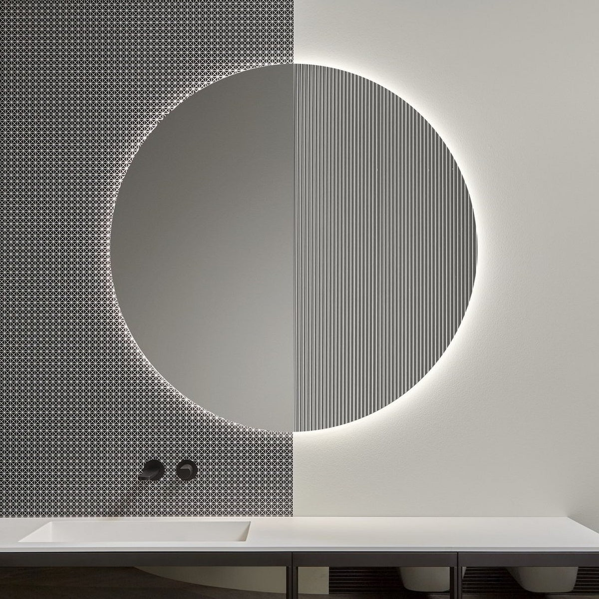 Superluna is the decorative bathroom mirror with a pure round shape and geometric expression. This wall mirror consists of two elements, one that performs as the mirror and the other the ornamental decorative side with a sober and elegant silver ribbed motif. Superluna is equipped with perimeter led lighting, which creates effects of architectural depth on the supporting wall.