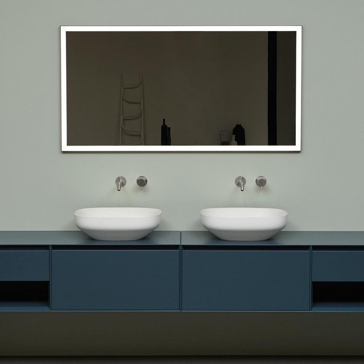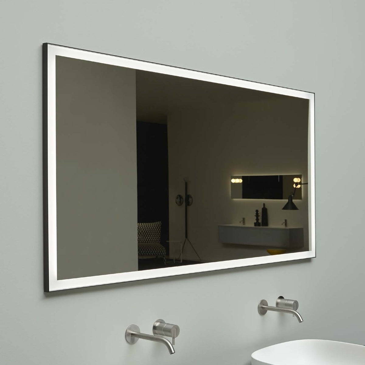 It reminds to a painting thanks to a 3 cm perimetral sandblasted frame equipped with led-lighting. Vertice is a 4 mm thick mirror sustained by a matt black aluminum structure and a precious bright frame reflecting everyday life in bath.