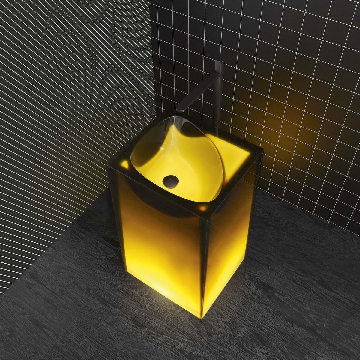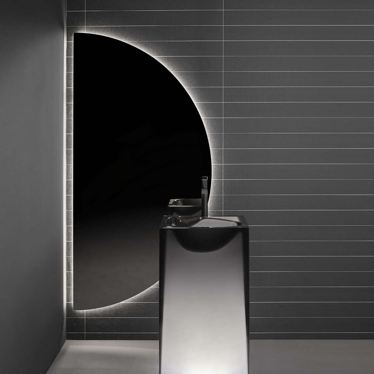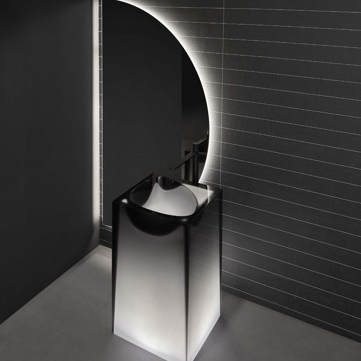 A rigorous and essential volume, softened by the translucency of Cristalmood, an absolute parallelepiped, devoid of any ornament, whose perfect geometrical shape is "carved out" by the force of the water which, drop by drop, generates the lowering of the Aura basin. The organic shape develops seamlessly as it does for natural phenomenon. The shape of the Astro basin is more decisive, almost a mold generated by a stone falling from above, by a powerful and concentrated force that "pushes" the material downwards according to an unprecedented geometry that becomes the stylistic code of the project.