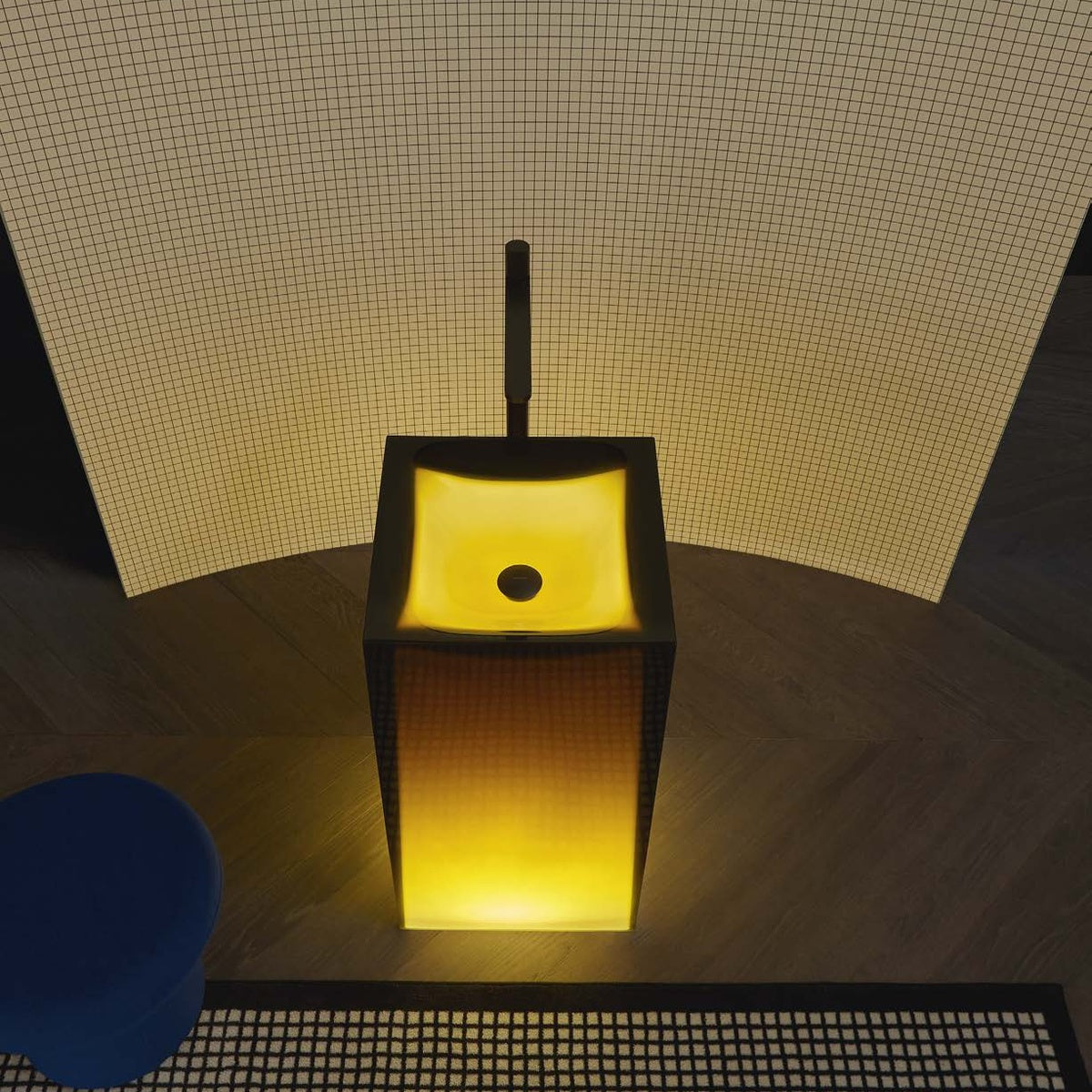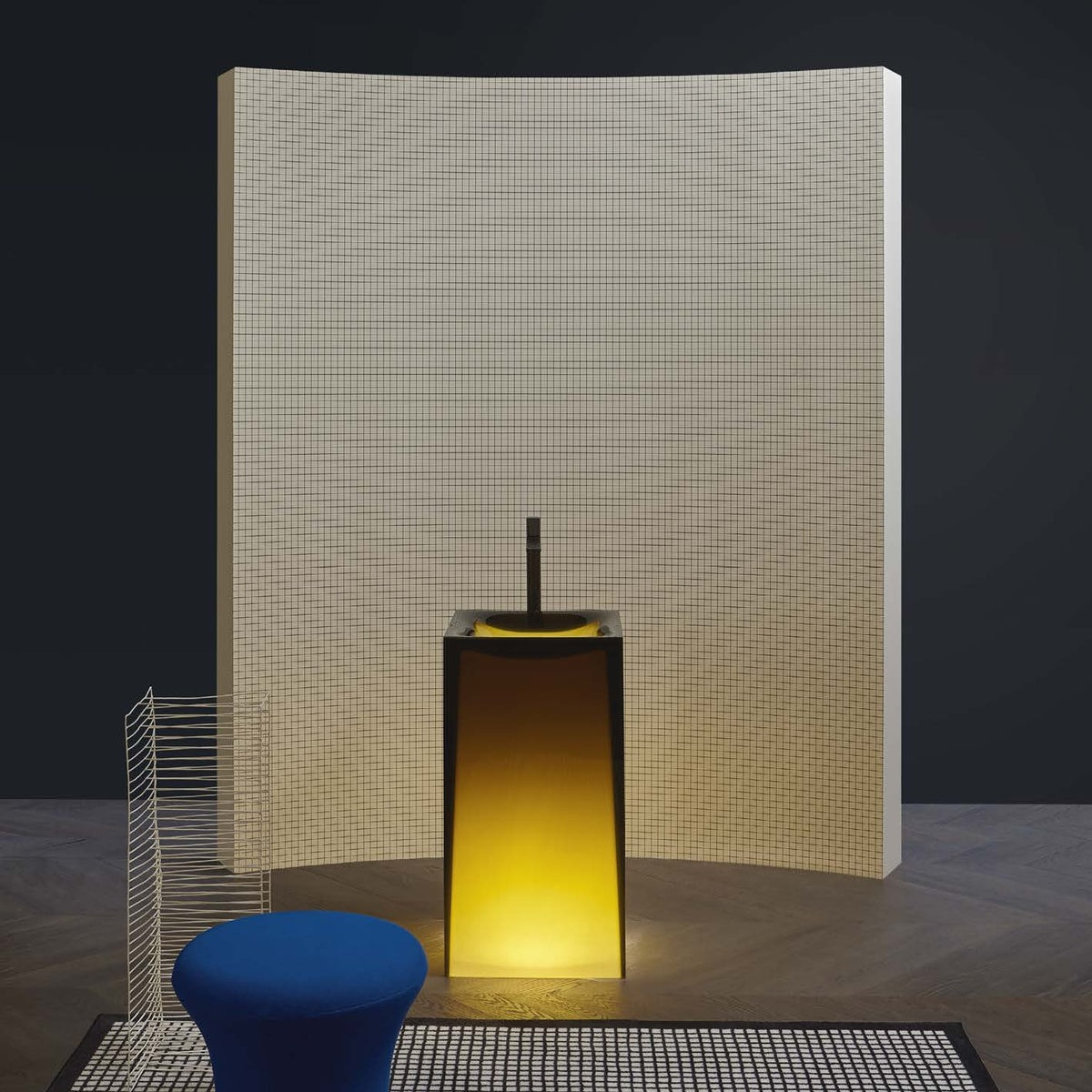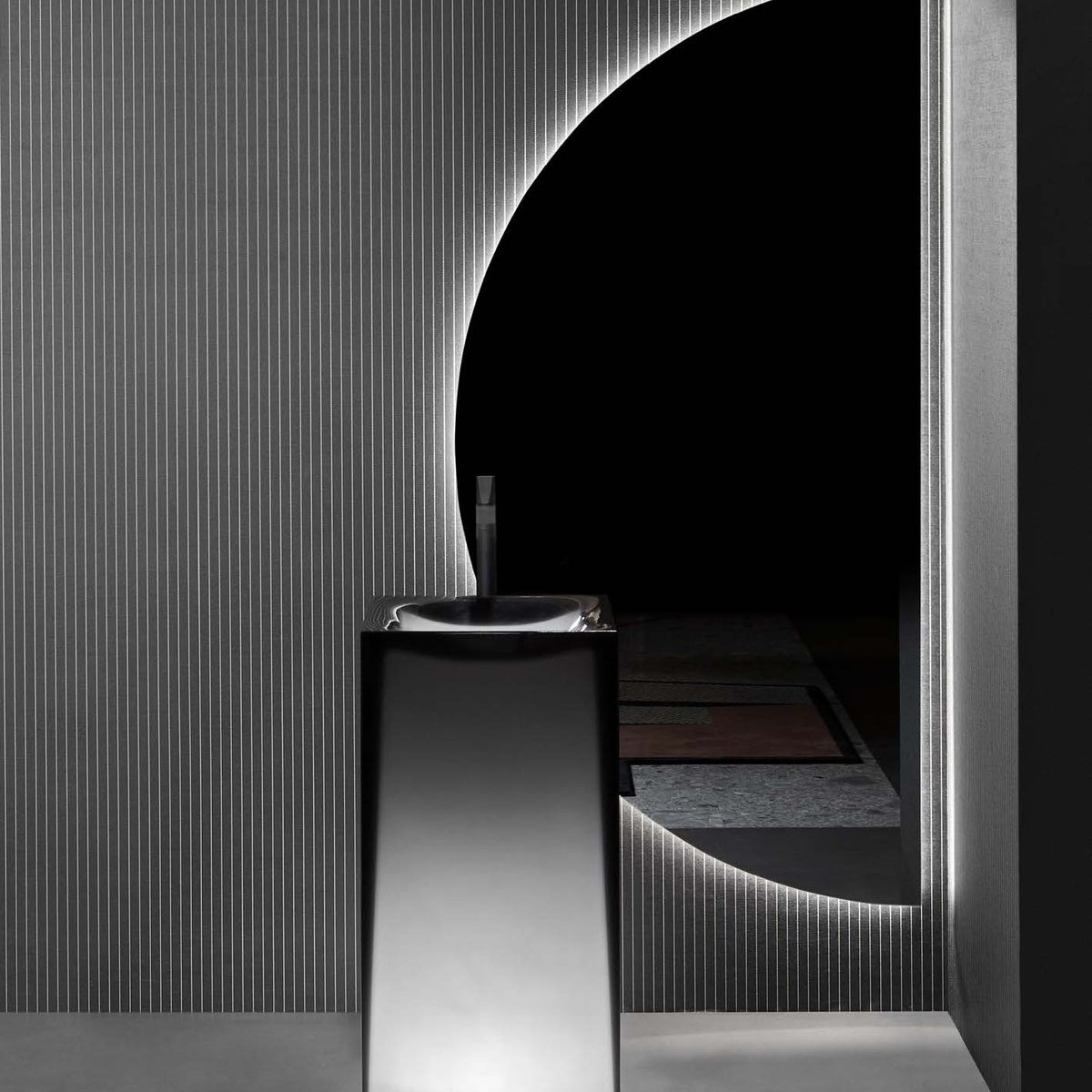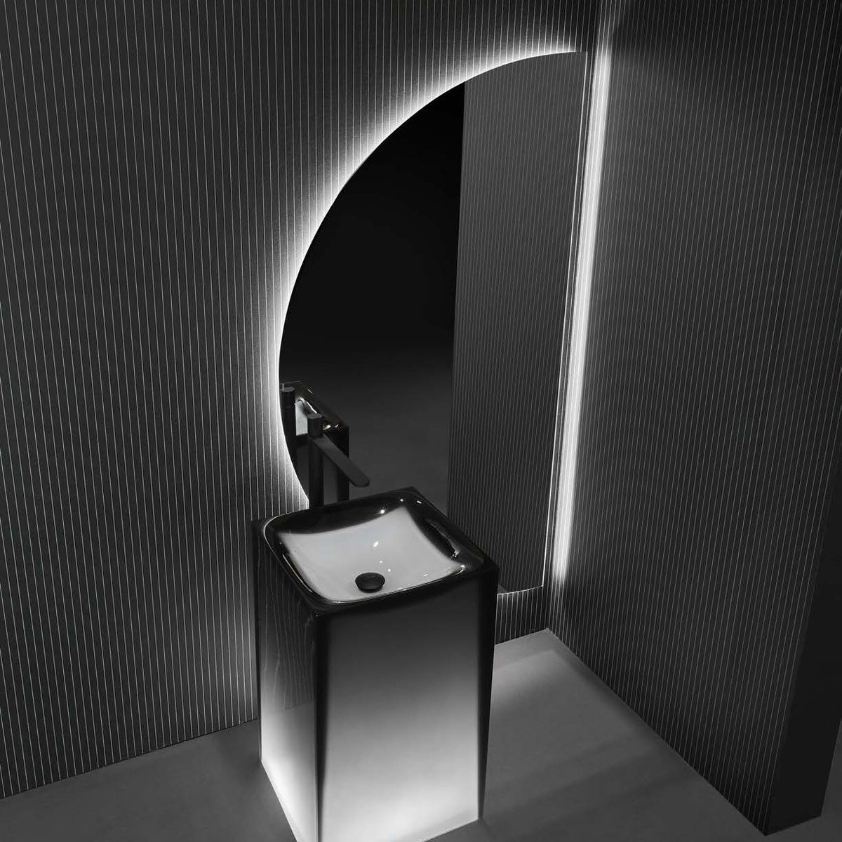A rigorous and essential volume, softened by the translucency of Cristalmood, an absolute parallelepiped, devoid of any ornament, whose perfect geometrical shape is "carved out" by the force of the water which, drop by drop, generates the lowering of the Aura basin. The organic shape develops seamlessly as it does for natural phenomenon. The shape of the Astro basin is more decisive, almost a mold generated by a stone falling from above, by a powerful and concentrated force that "pushes" the material downwards according to an unprecedented geometry that becomes the stylistic code of the project.