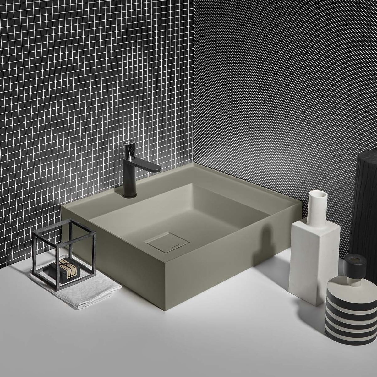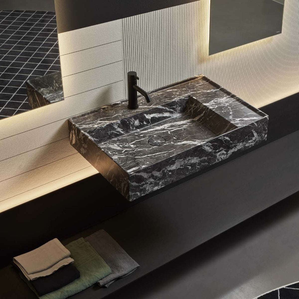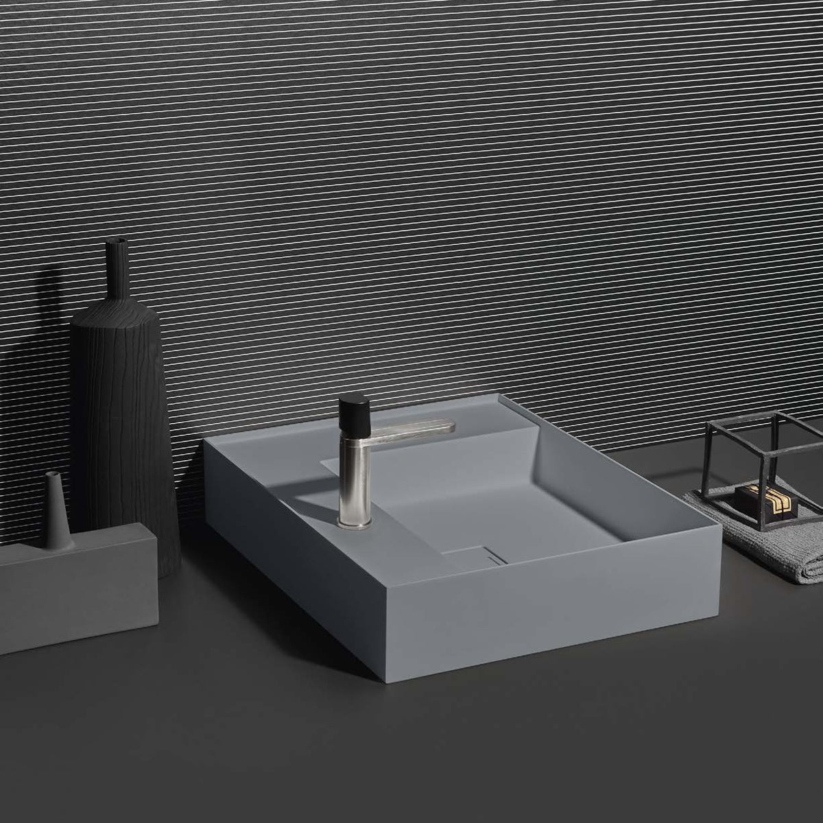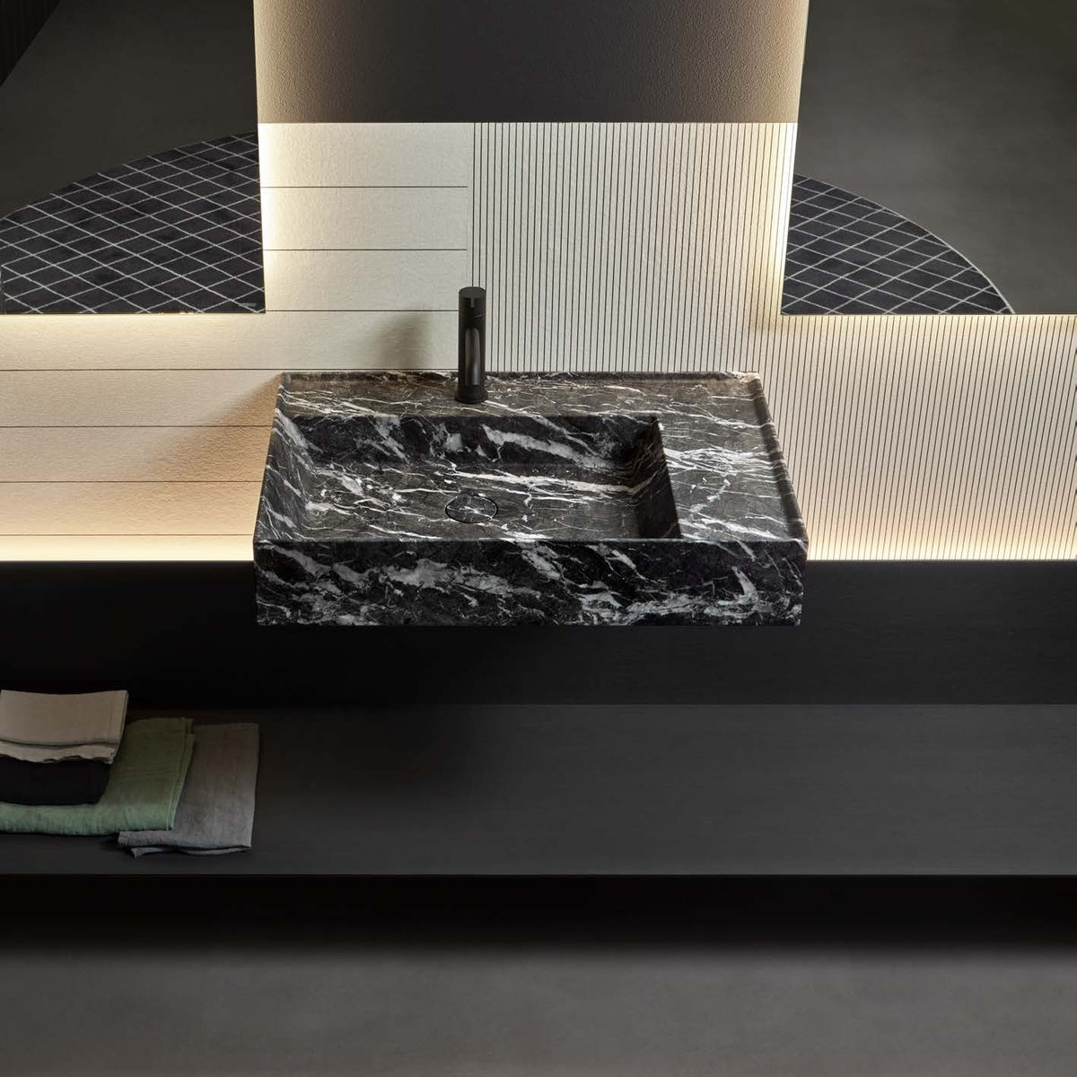 New proportional and formal balance born from the intersection of squares, circles, and rectangles, alternation of smooth and raised areas that capture unexpected three-dimensionality. Graffio is a collection of different washbasins, top or wall mount, made of Flumood, Colormood, Marble or Stone. The extreme thinness of the borders define a perimeter that encloses all the functions of the basin: the basin, the back surface where to install the faucet as well an additional surface.