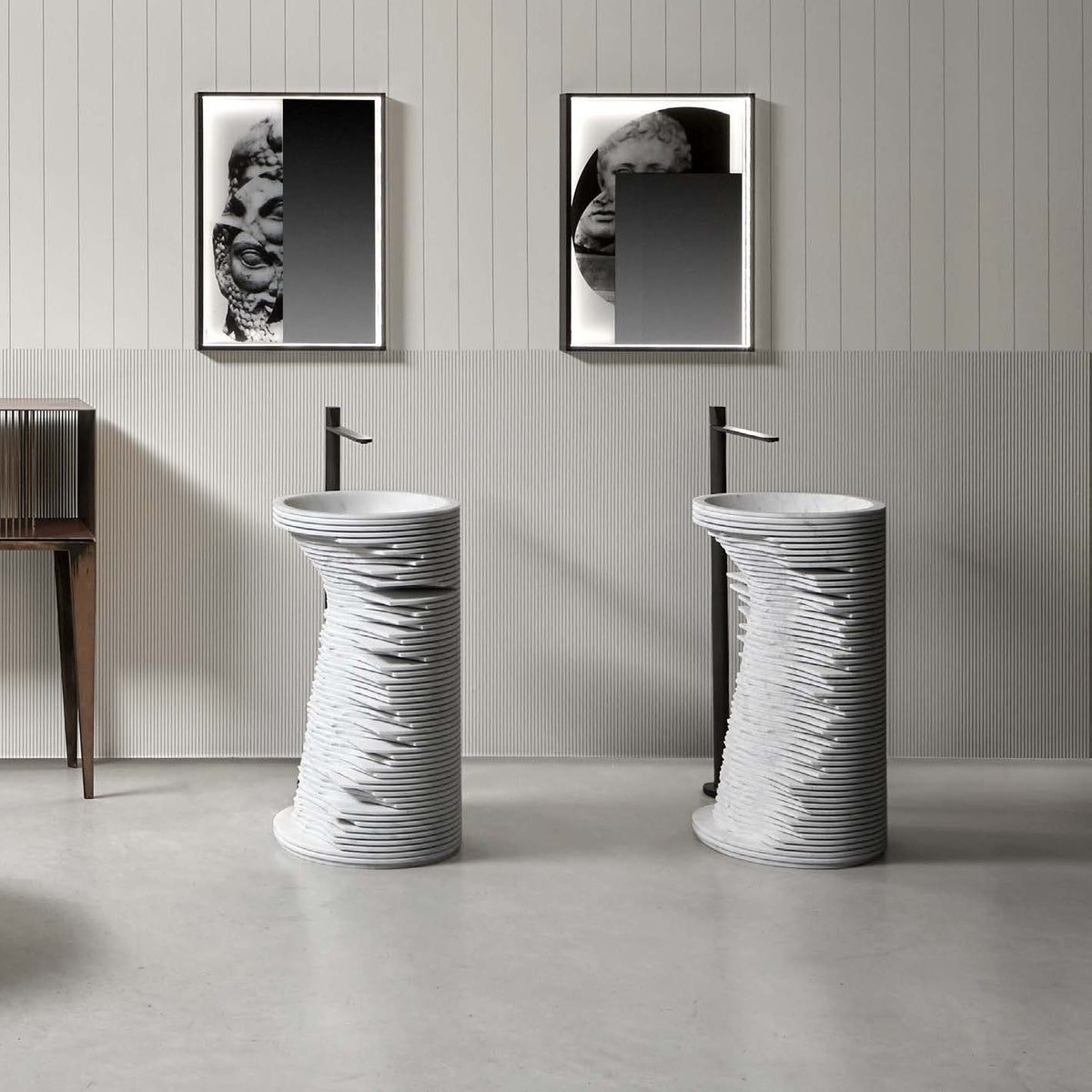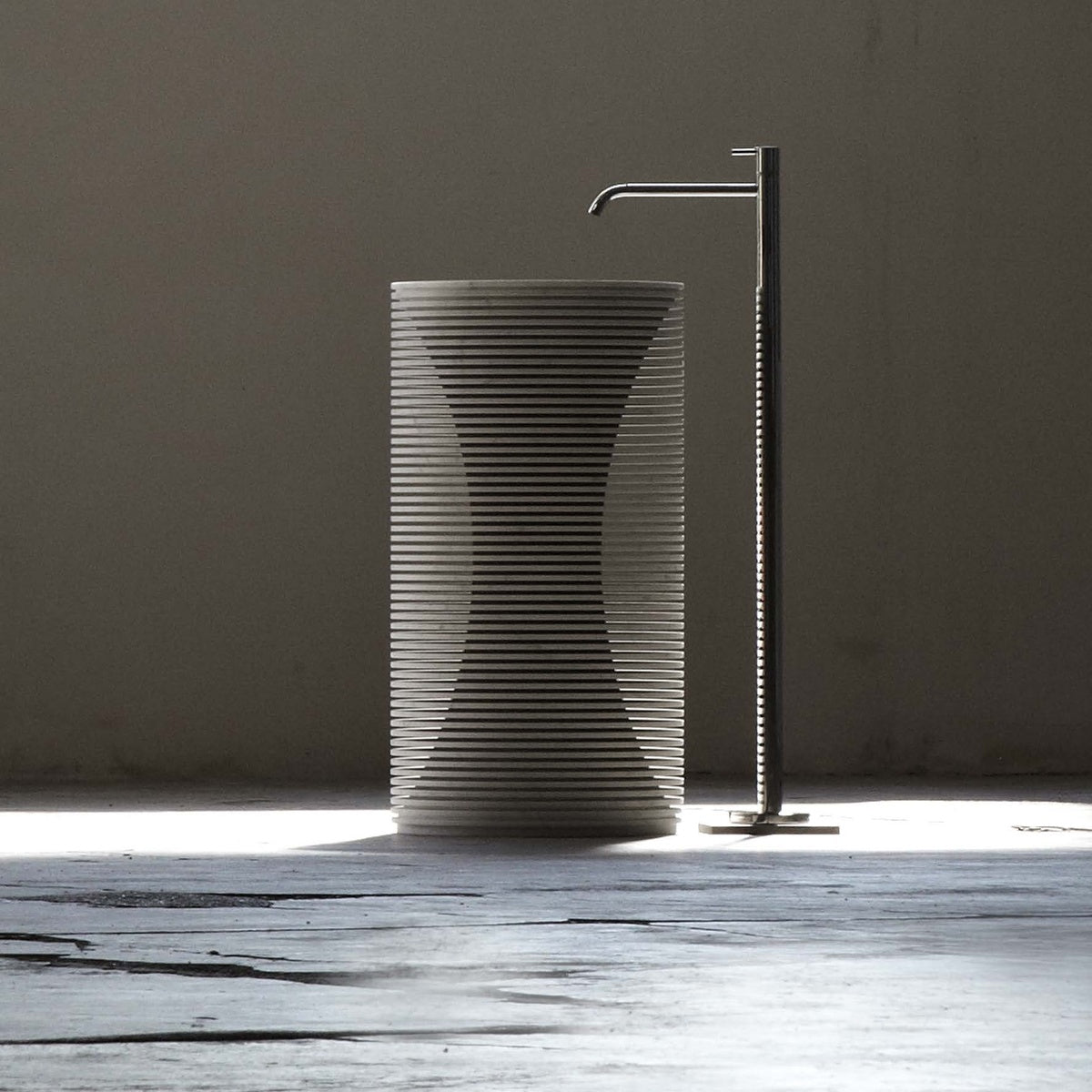 The shape within the form was the idea that accompanied from the very beginning the project by Paolo Ulian for antoniolupi.A project born by observing the first rough draft by machine of marble sculptures, in which the three-dimensional shape is outlined by a regular series of cuts managed by a numerical controlled machine. Thin strips of marble are formed, whose outer edges once broken, reveal the raw sculpture concealed inside.