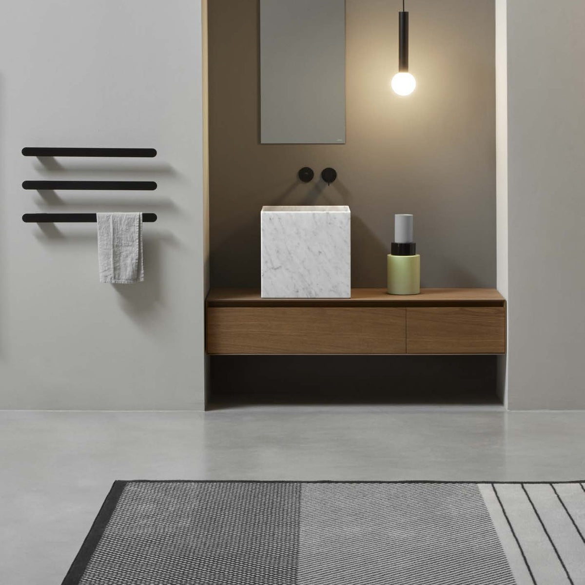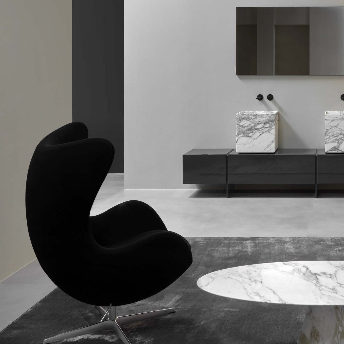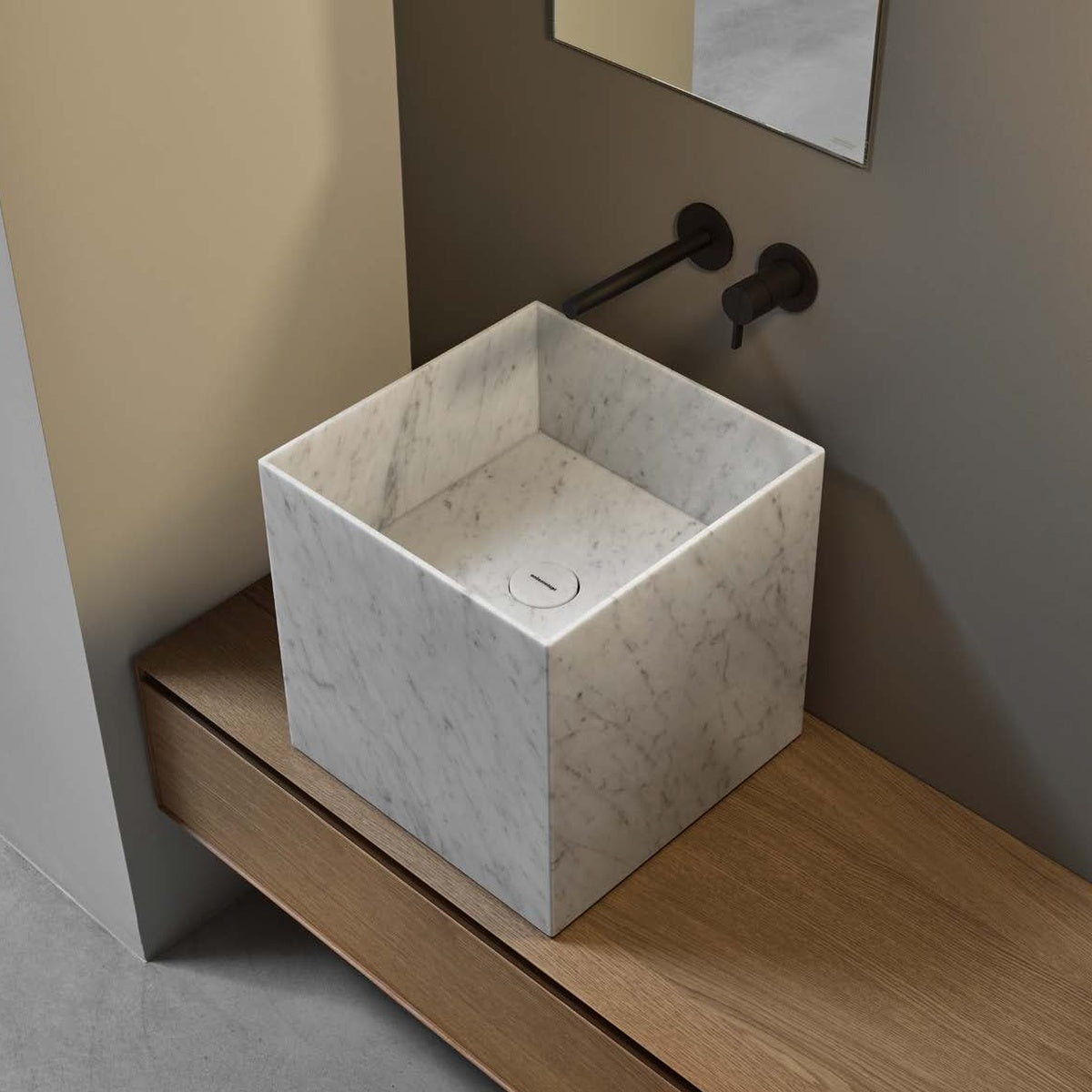 The top with sinks and storage spaces are combined with a series of wall-hung or floor-standing cabinets with essential and rigorous aesthetics that go along with that idea of lightness and sense of measure that is in the collection's DNA. Thus, are born different designs and configurations that interpret the specific needs of the washbasin area of each project, also thanks to the possibility of joining several blocks through a connecting element that ensures the continuity of the configuration by placing them side by side without interruption. The Nabatei collection is also declined in cube-shaped sinks (size 40x40x40 cm), also made of marble, which can be installed on the wall or on shelves or suspended furniture to form a micro-architecture made of balanced proportions, refined material combinations, and sophisticated details. In the freestanding version, the important volume of Nabatei is placed on the floor, and the shelf that flanks it can be used to accommodate the taps, otherwise placed on the wall, or as a shelf for objects of daily use. The collection is completed by the top mounted sinks with reduced height volumes, light elements that rest delicately on the top, both in the oval version made of cristalmood and in the rectangular version, available in cristalmood or marble.