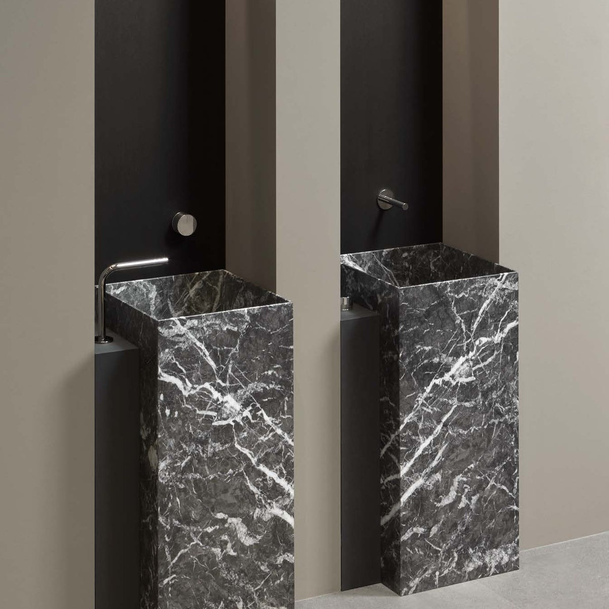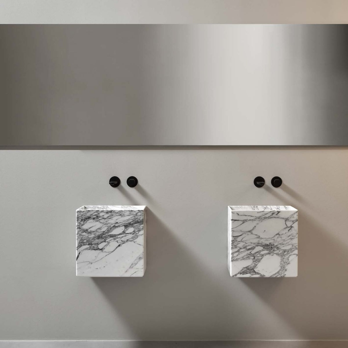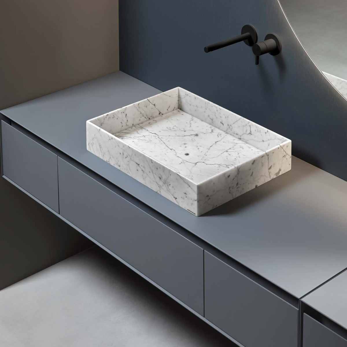 Sculptural and monumental even in their essentiality, carved in stone like the ancient city of Petra, bearers of a value of absolute and timeless beauty that is inherent in the exclusivity of marble and expressed through human design. The Nabatei sinks collection, named after the merchant people of ancient Arabia, consists of a series of solid marble tops carved to form the basin of the sinks and storage compartments. Sinks of different shapes and sizes, drawn by orthogonal geometric lines defined by thin thicknesses of the material. An essential sign that is enhanced by the uniqueness of the stone, the infinite chromatic shades, the unrepeatable variations of color. An explicit reference to nature and man's willingness to govern it. The zenithal view of the tops reminds of the image of land divided into cultivated plots and bordered by Sicilian dry-stone walls or the elevation changes of eastern cultivated terraces. The different portions of the top separated by the inner edges can house the taps, store objects and accessories for daily use, or take on the primary function of a basin for the washbasin, identifiable by a small hole from which to drain water.