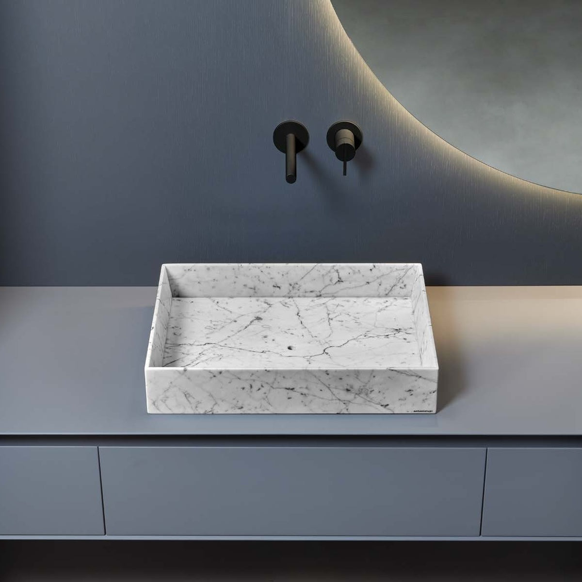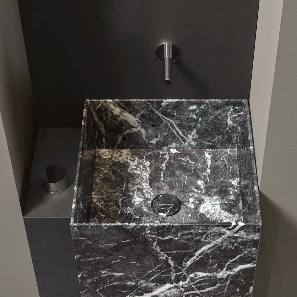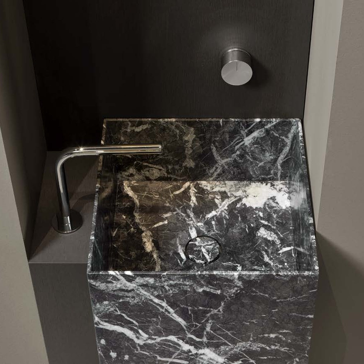 Sculptural and monumental even in their essentiality, carved in stone like the ancient city of Petra, bearers of a value of absolute and timeless beauty that is inherent in the exclusivity of marble and expressed through human design. The Nabatei sinks collection, named after the merchant people of ancient Arabia, consists of a series of solid marble tops carved to form the basin of the sinks and storage compartments. Sinks of different shapes and sizes, drawn by orthogonal geometric lines defined by thin thicknesses of the material. An essential sign that is enhanced by the uniqueness of the stone, the infinite chromatic shades, the unrepeatable variations of color. An explicit reference to nature and man's willingness to govern it. The zenithal view of the tops reminds of the image of land divided into cultivated plots and bordered by Sicilian dry-stone walls or the elevation changes of eastern cultivated terraces. The different portions of the top separated by the inner edges can house the taps, store objects and accessories for daily use, or take on the primary function of a basin for the washbasin, identifiable by a small hole from which to drain water.