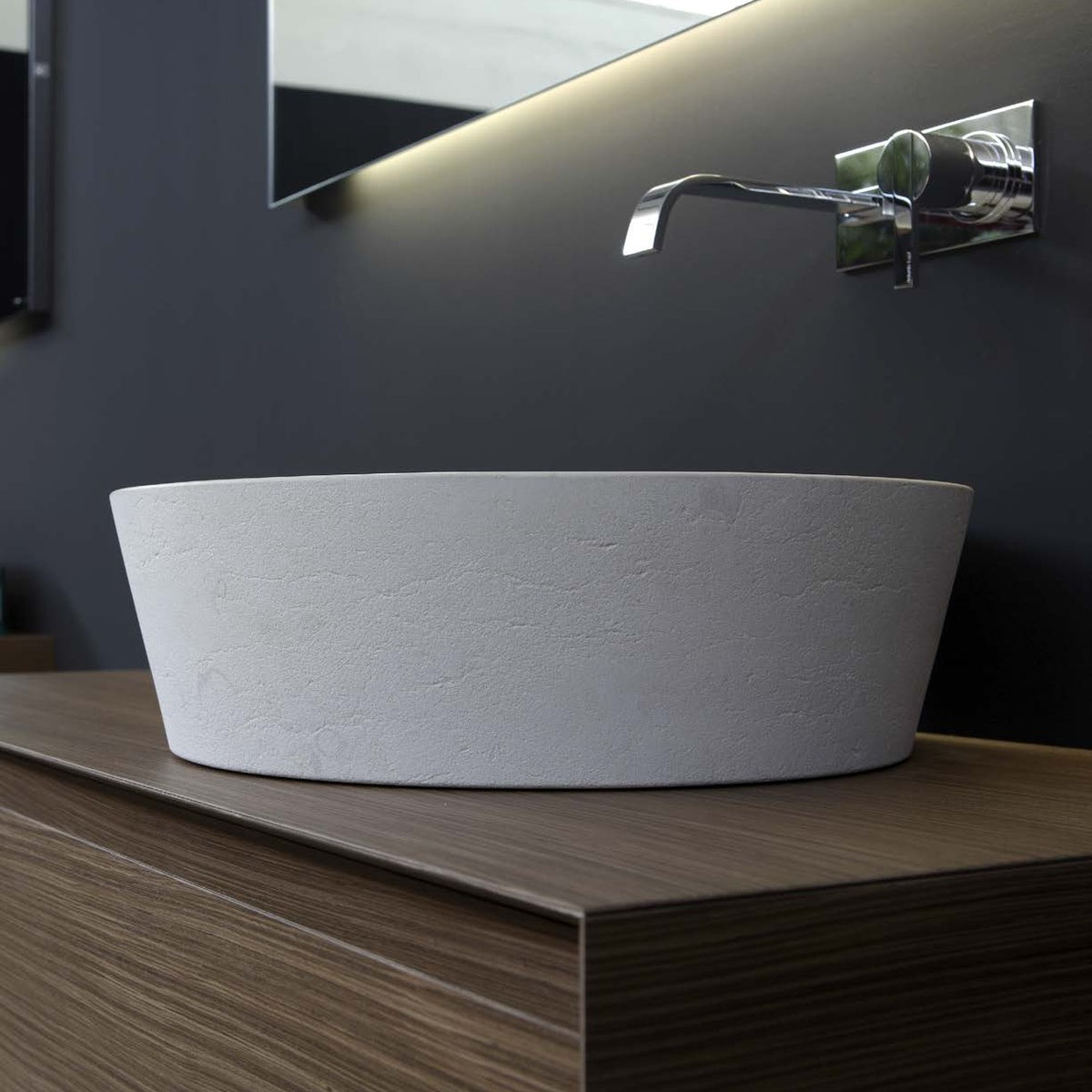 A perfect geometric shape, a ring from the sloped sides and thick edges. A basin that conveys the solidity of the stone through a simple and absolute image. Pila is a round basin above all essential but at the same time important. A modern character dictated by net lines accompanying the circular shape.