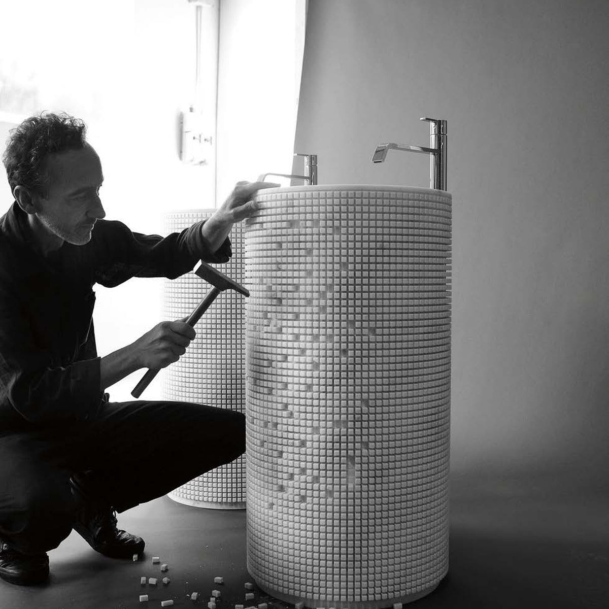 Tradition meets technology in a decomposed standardized form, sectioned, intersected by an orthogonal lattice, a cylindrical volume on which the machine has mapped out a clear and definite sign according to a project that leaves open endless possibilities of composition. A freestanding ever-changing sink due to the elimination of pieces imagination can take shape, the image is revealed, the essence comes to light. Lights and shadows, depth and reliefs, combinations and distances, connections and insulation. The pixel game that forms the basin is completely oriented on consequentiality, on proximity, on decorum that comes from the material itself. A gesture, that of subtraction, revealing the shape, which allows you to customize the volume, and which amplifies the three-dimensional design of the project. Pixel is subtraction to compose.
