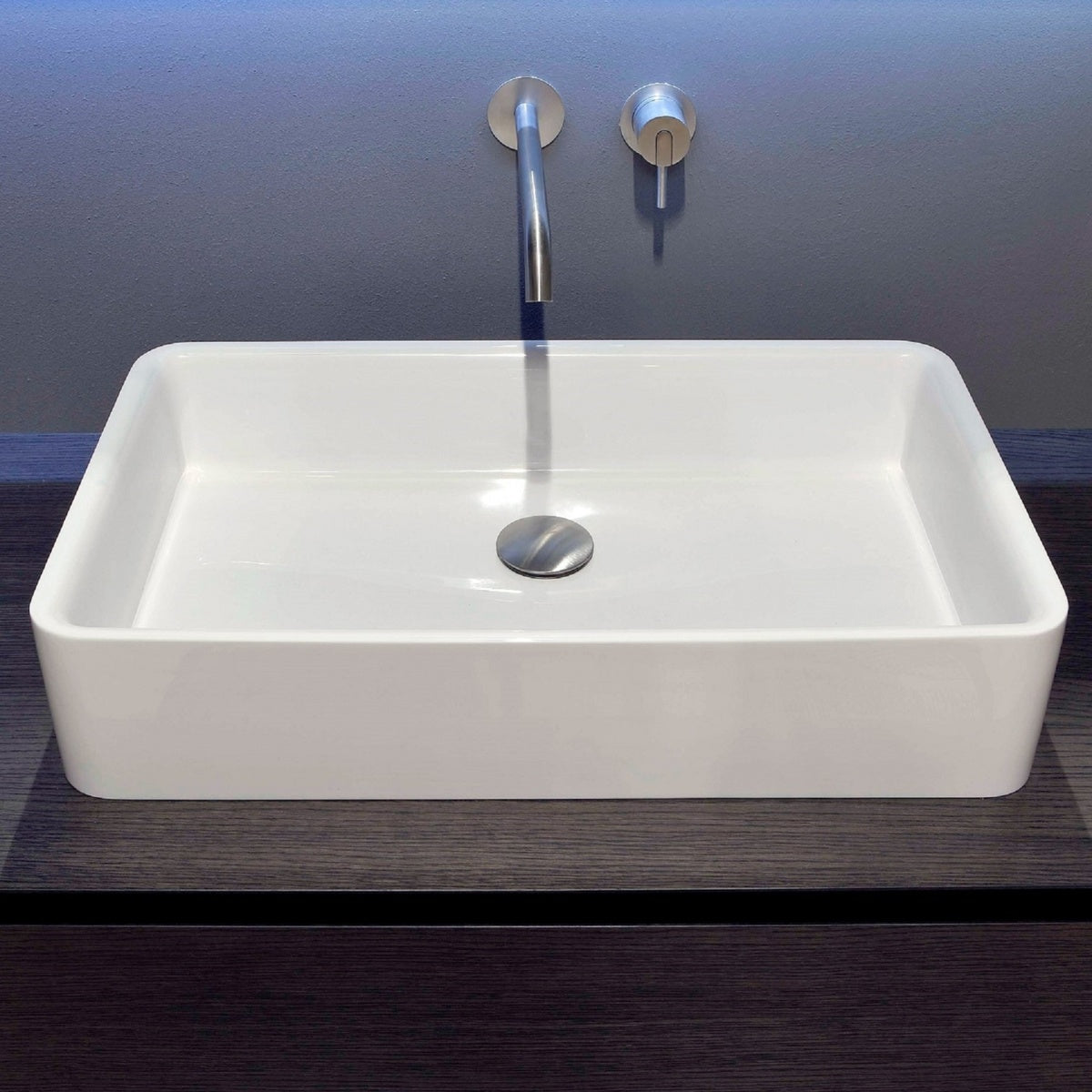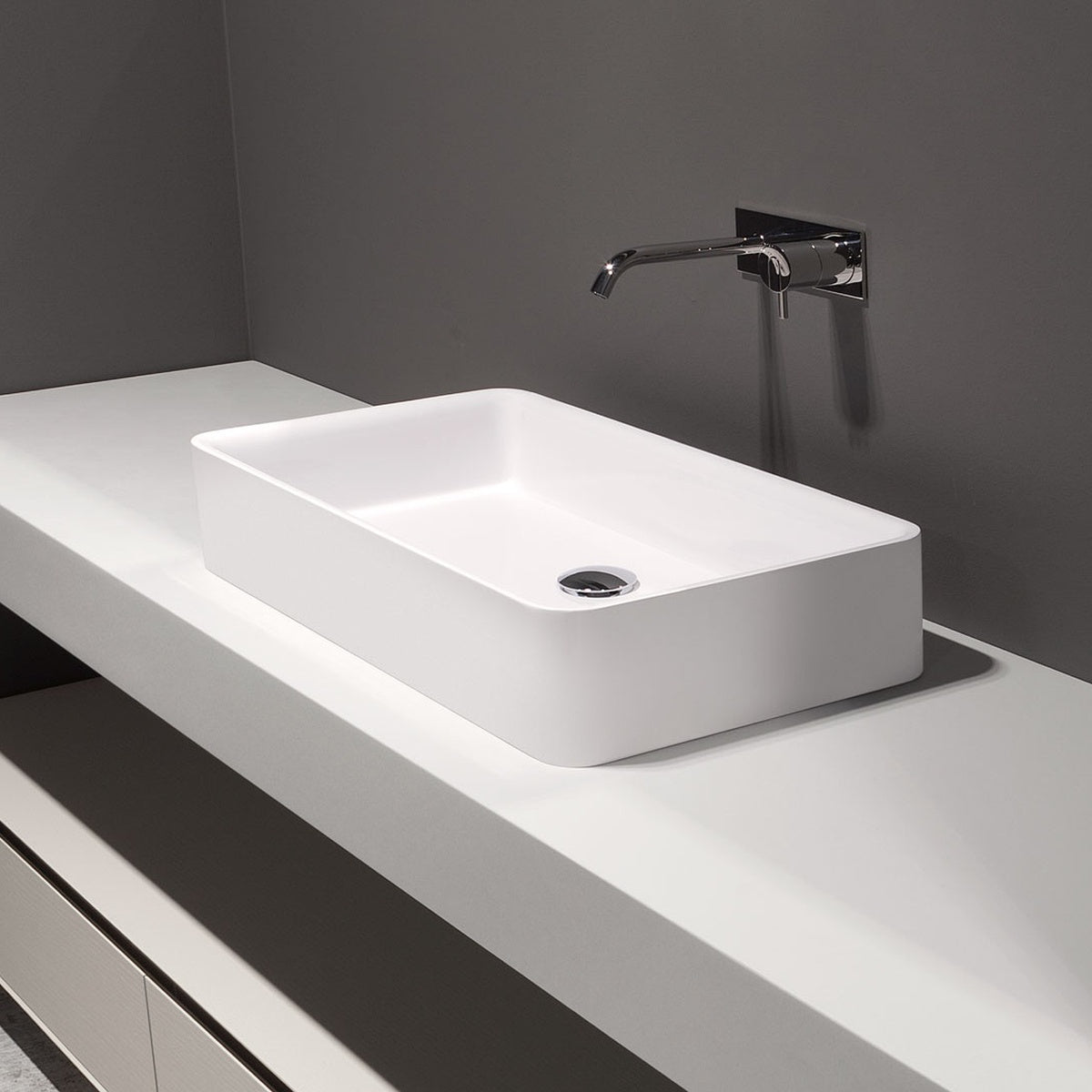 The soft edge geometry of the border is the hallmark of Servoretto, the rectangular sink made of Flumood o Colormood. The malleability of the material makes it possible to create continuous surfaces, the gentle fittings imply that the power of water has shaped the volume by eliminating sharp edges and unnatural cuts of matter.