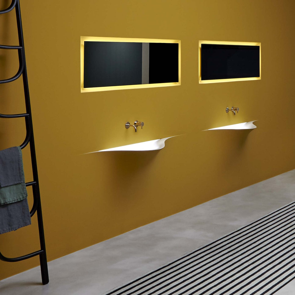 A bare sink made entirely in Moodlight and than seamlessly integrated in the wall which blends best when the same material and colours as the wall are used to complete it. The sinuous movement can be emphasized with the perfection of the finish and absolute continuity of the coating that leaves colour as the lead player and light the role to exalt it showing that something magical is happening.