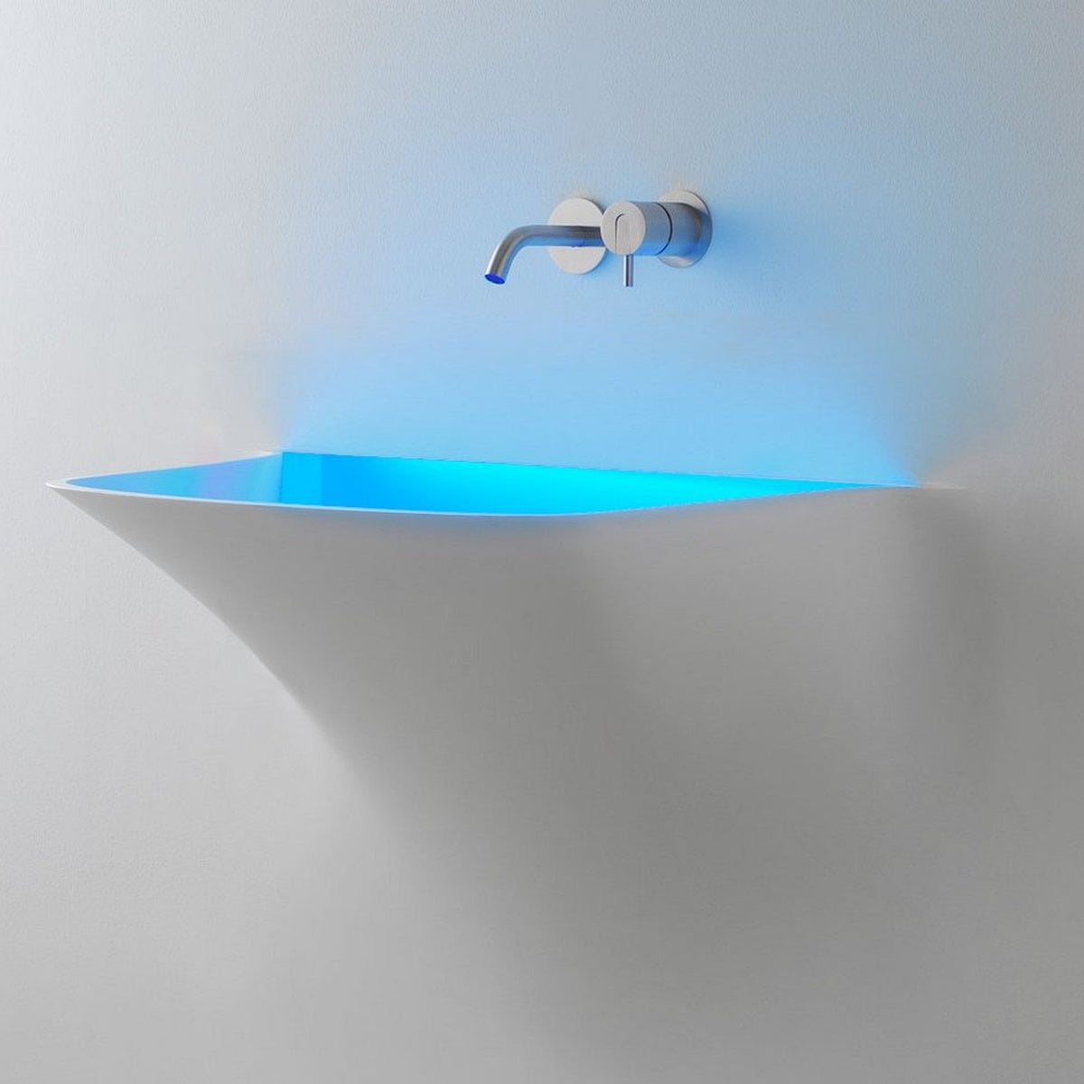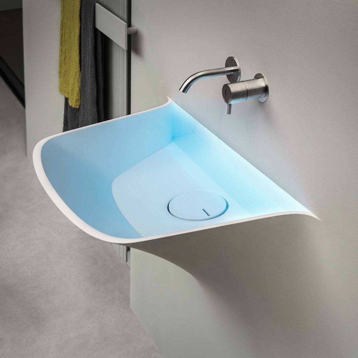 Born from the synthesis between Strappo and Silenzio defining the best symbiosis of these basins with the wall from which they are generated. Soffio is originated by a light gust of wind that delicately transforms the surface. Without the force of Strappo, without the organic shape of Silenzio but proposing a more known image.
