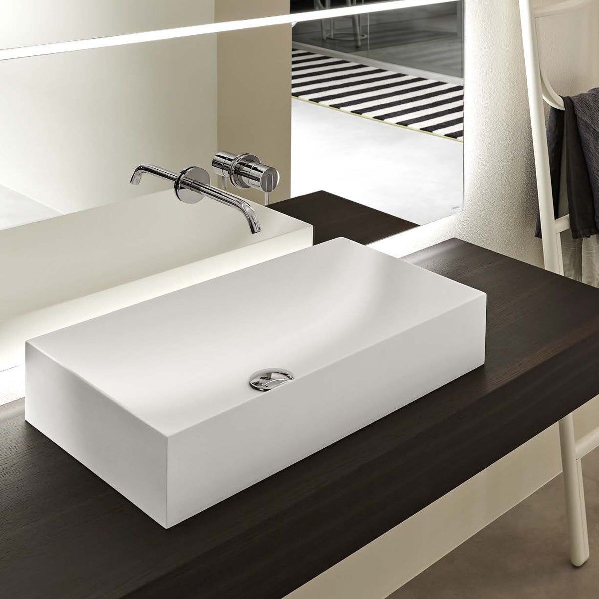 The sharp lines and the rigorous external geometrical shapes are softened with the fluidness of the internal shape of the basin. Stratos is a mixture of two souls integrated in an elegant and harmonious manner. It’s rigid perimeter expresses safety and solidity protecting an organic interior that extends without interruption.