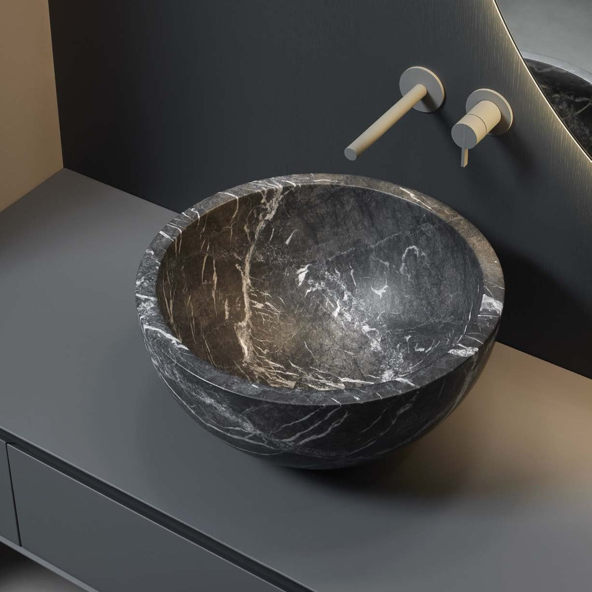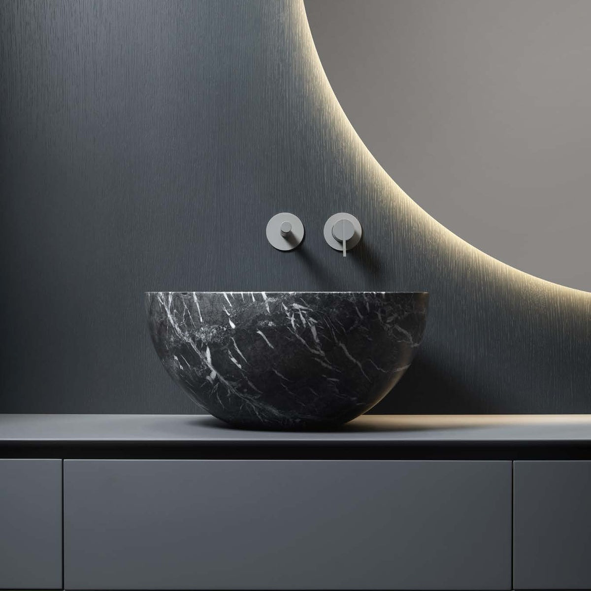 A perfect half sphere, clear and precise in its form, statuary and sculptural in its presence. Urnamood rests gently with absolute geometry triggers an almost ancestral relationship with the rest of the composition of which becomes the fulcrum and generating element. It attracts the attention on itself focusing the forces present in space from which it gains strength to guard the primordial element.