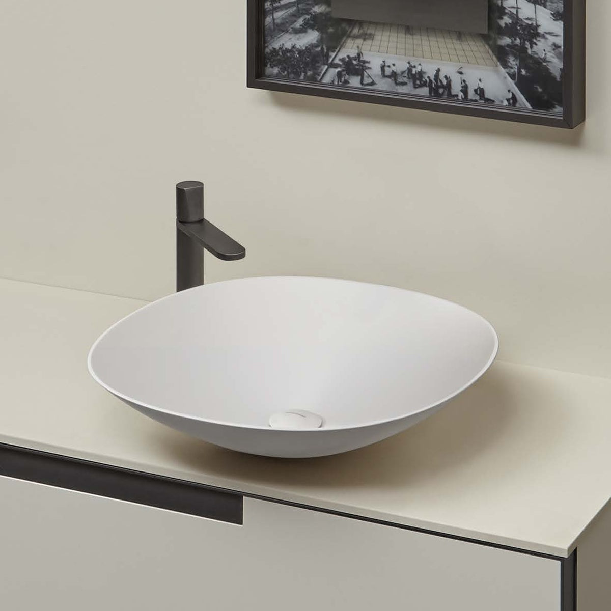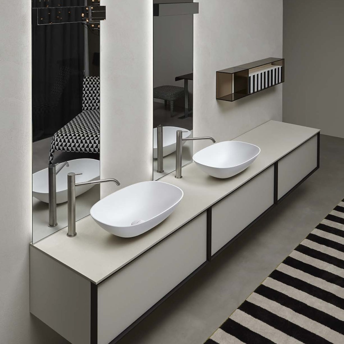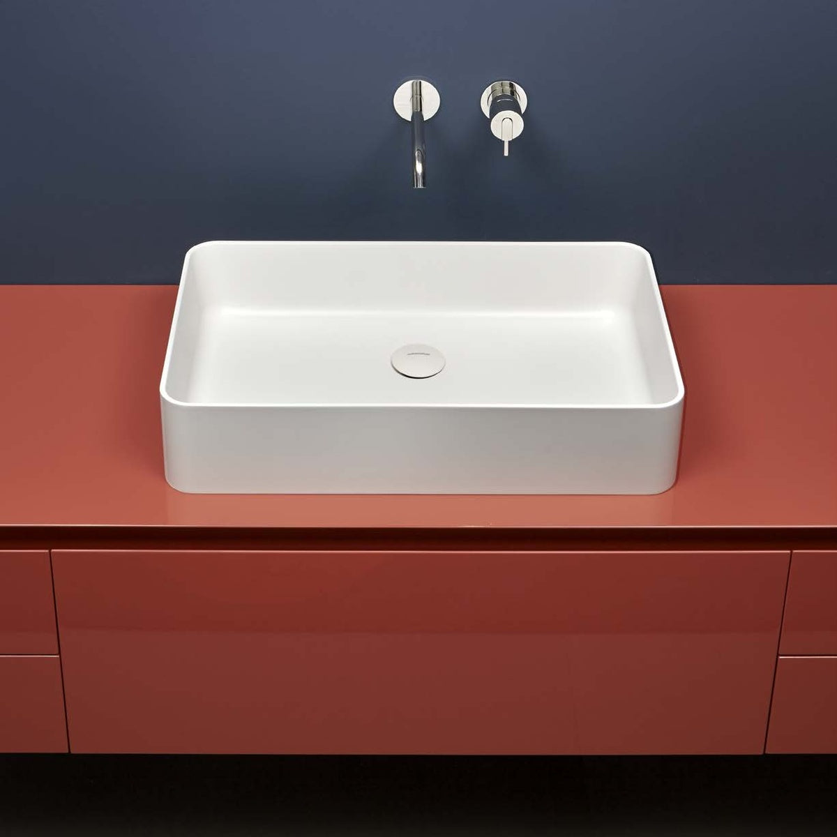 Versatile, transversal, perfect to fit in different environments. The Velo washbasin collection, available in round, oval and rectangular shapes, is updated to meet a contemporary inclination. Considering the original concept, geometry and dimensions of the series, the edges are 5 mm giving greater lightness to the whole and at the same time ensuring a greater volume of the basin. The typical round and oval shapes remain unmodified with a very narrow base for support and a wider bowl, while the rectangular version with rounded corners has a perfectly perpendicular volume.