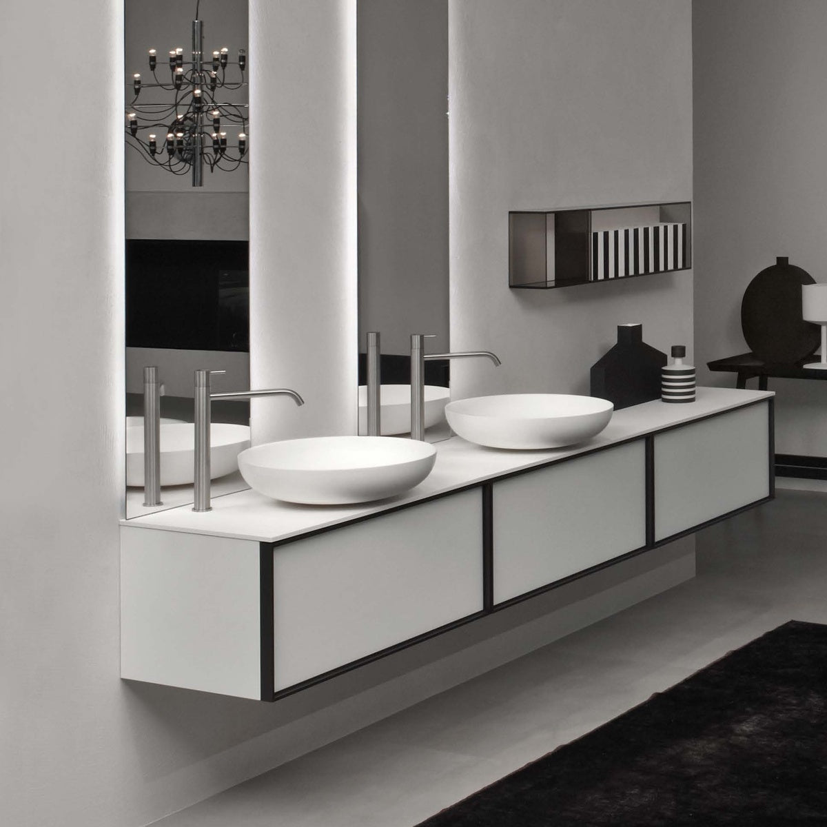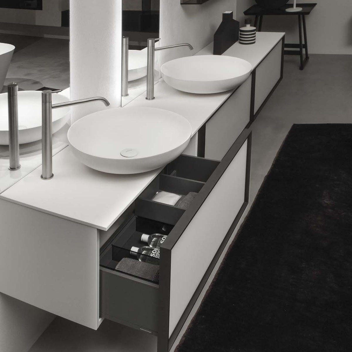A perfect circle, drawn by the thin edges of Flumood or Colormood, a geometry that creates a shallow basin. A total light picture, a measured balance which competes with the absence of the base, which almost disappears from view. A washbasin that marries contemporary new modules, the homogeneous lacquered finishes, the sophisticated and fine details, sharp and precise tracks.