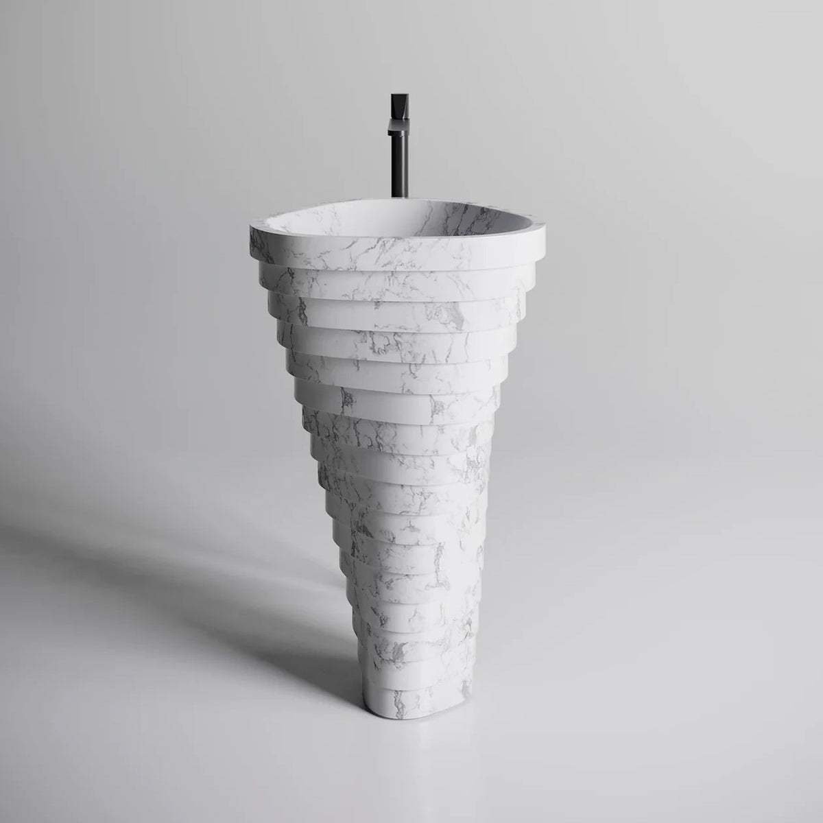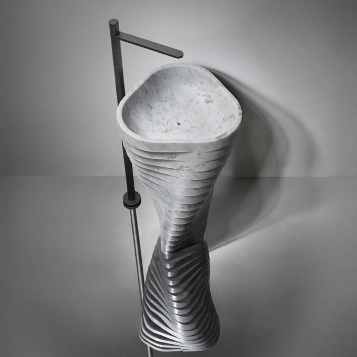 In Vortice, matter takes shape through human thought and the use of advanced processing technologies. A project that best expresses this virtuous cycle between nature, man and machine. Vortice is born from the earth, or rather from the quarry, when the marble block is extracted. It has a small base and develops upward through a revolving movement generating fluid and sinuous geometries accentuated by the unique veins and the plastic like behavior of the material.